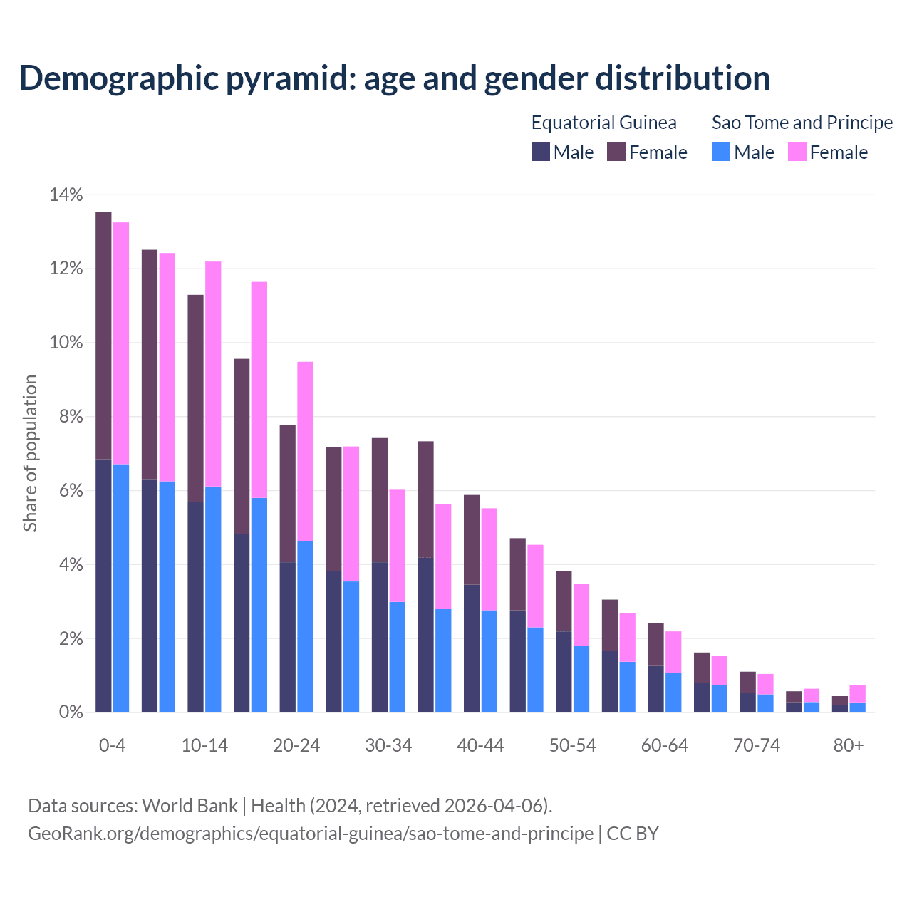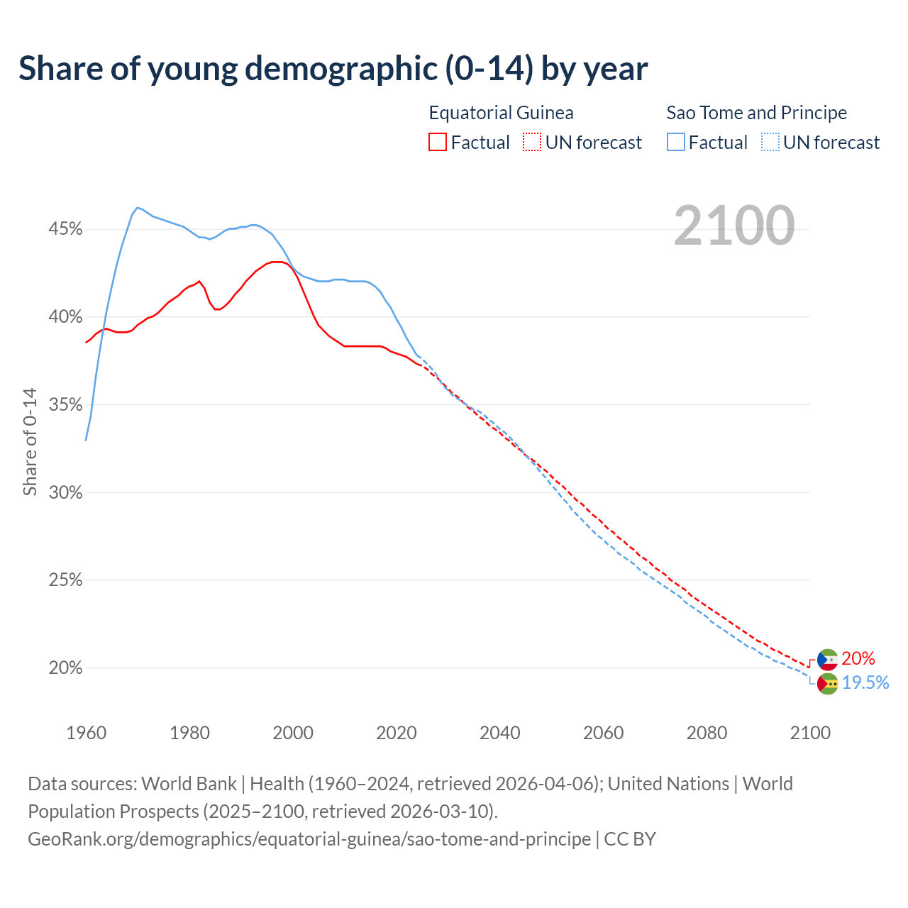 - The share of young demographic (0-15 years old) in Equatorial Guinea is 37.3% vs 37.8% in Sao Tome and Principe.