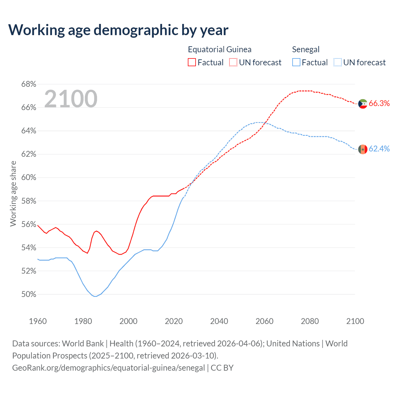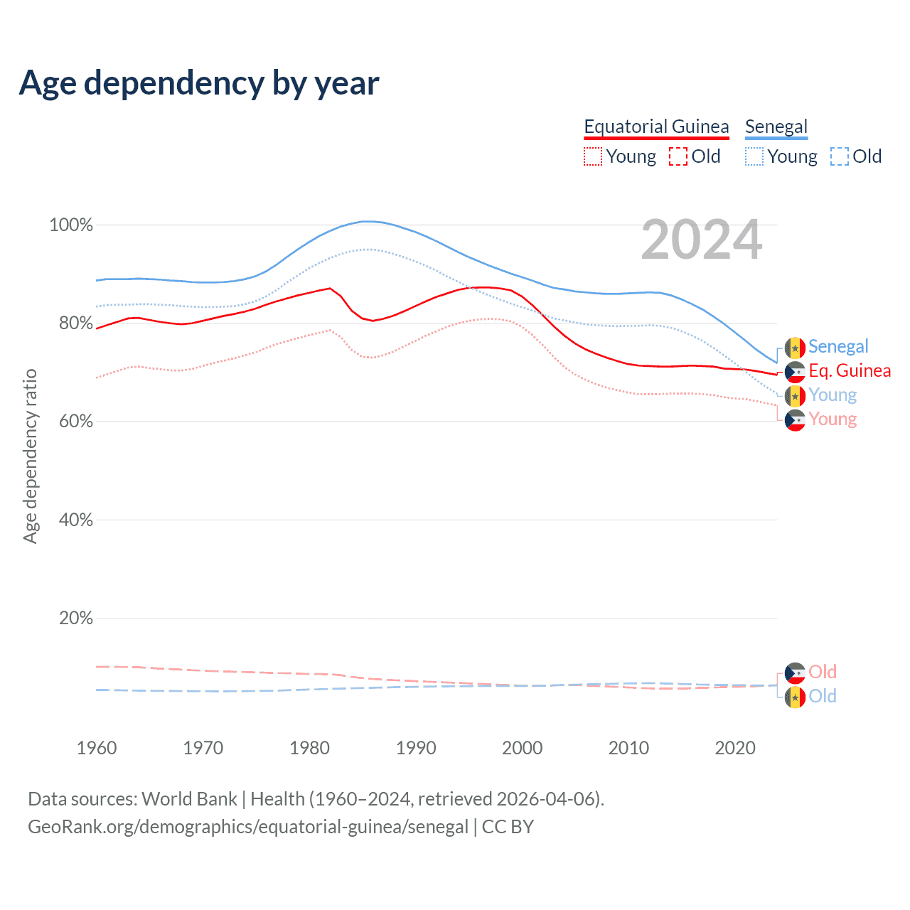 - The share of old-age demographic (65+) in Equatorial Guinea is 3.69% vs 3.62% in Senegal.