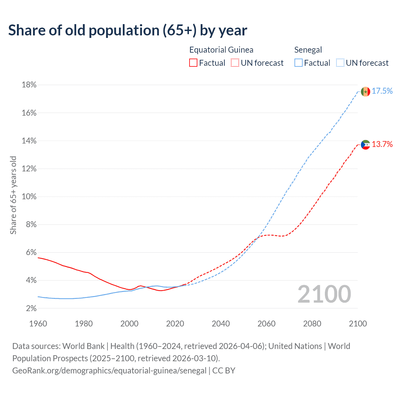 The share of older people aged 65 and over is 3.69% in Equatorial Guinea and 3.62% in Senegal. Life expectancy in Equatorial Guinea compared to Senegal .
