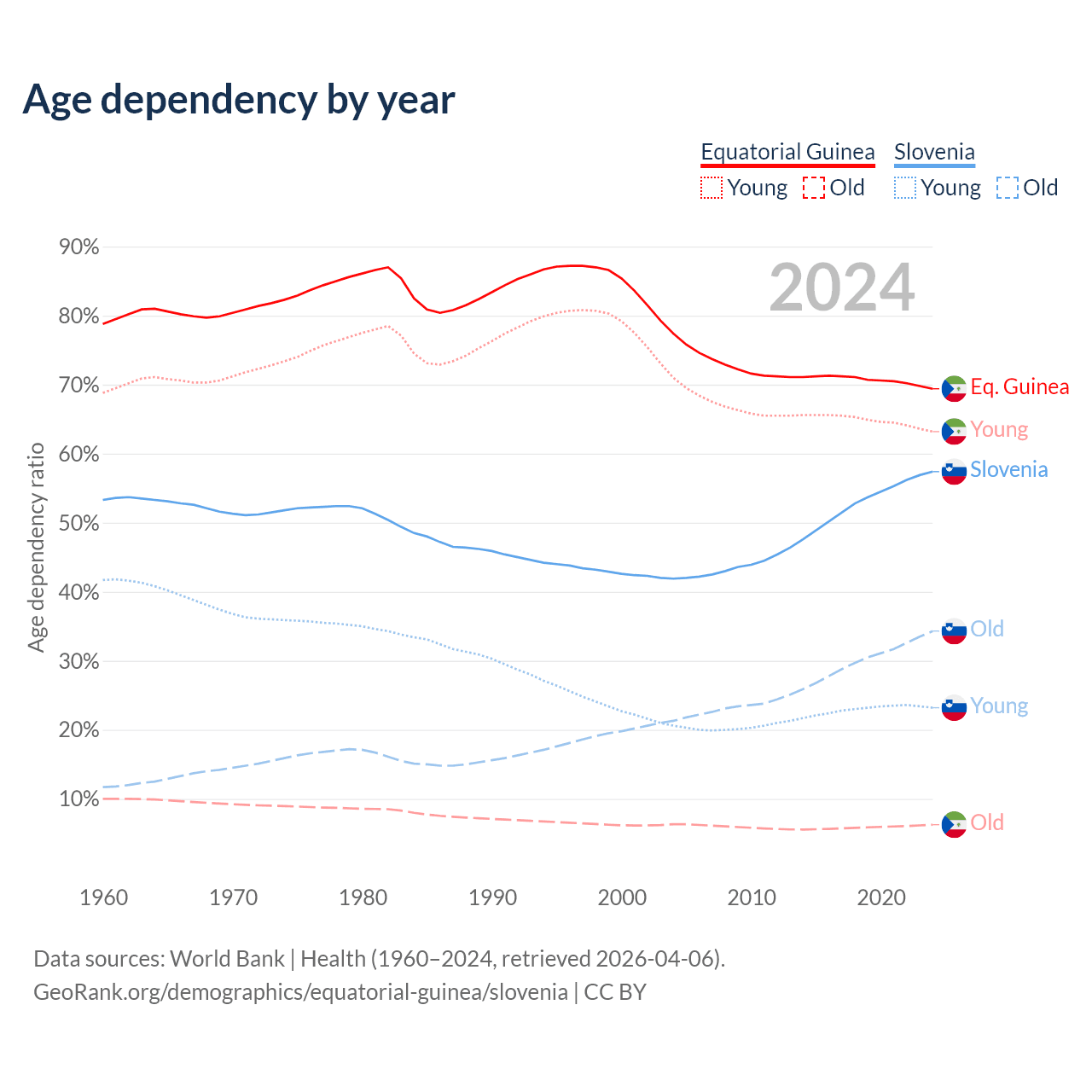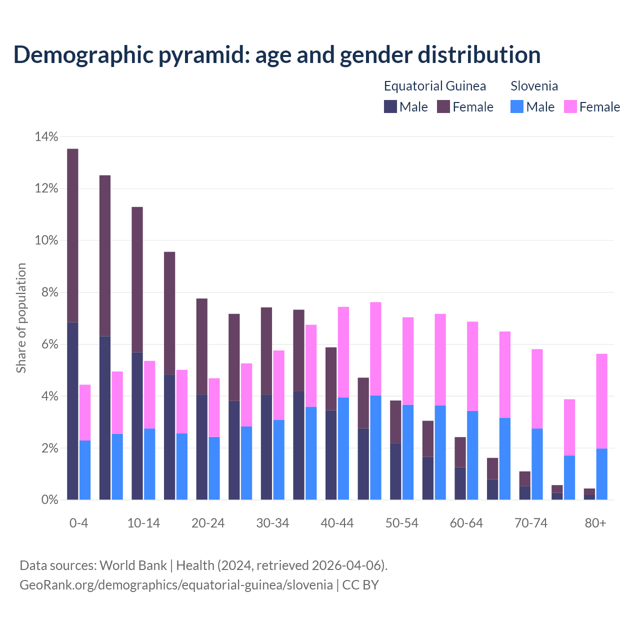 - The share of old-age demographic (65+) in Equatorial Guinea is 3.69% vs 21.8% in Slovenia.
