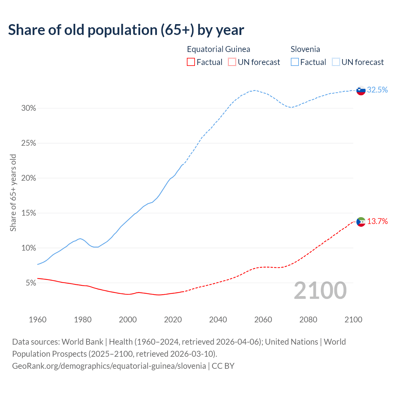 The share of older people aged 65 and over is 3.69% in Equatorial Guinea and 21.8% in Slovenia. Life expectancy in Equatorial Guinea compared to Slovenia .