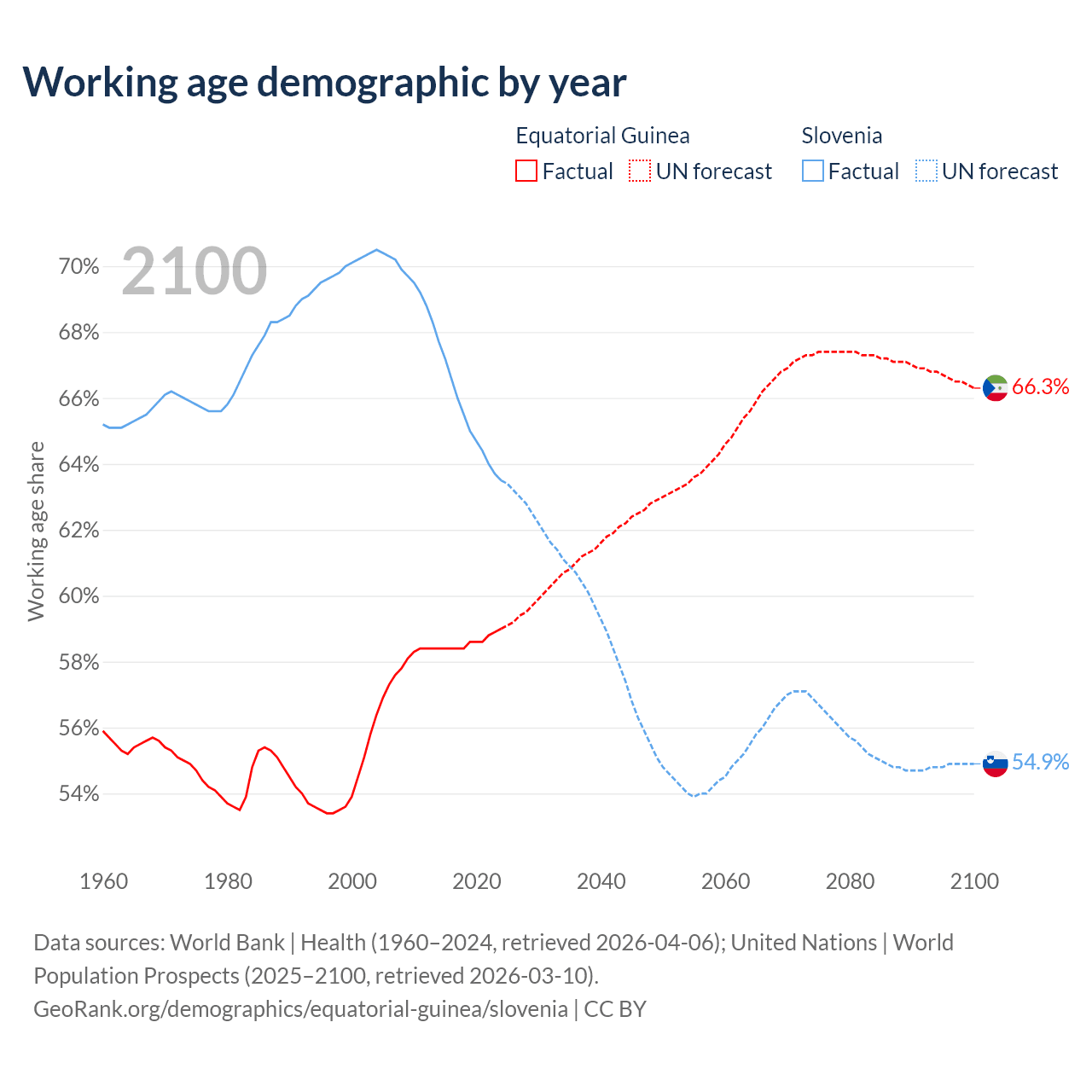 - The share of young demographic (0-15 years old) in Equatorial Guinea is 37.3% vs 14.7% in Slovenia.