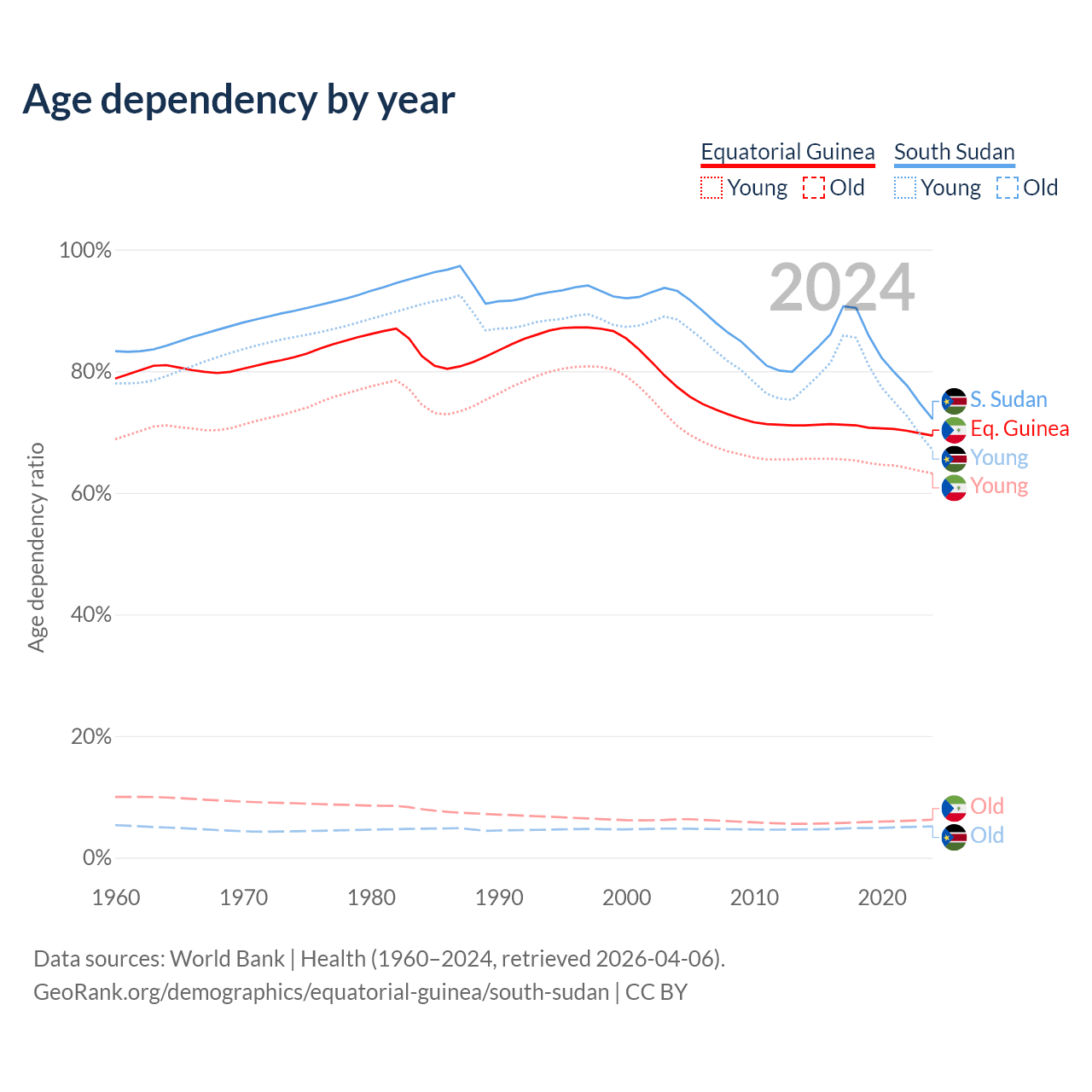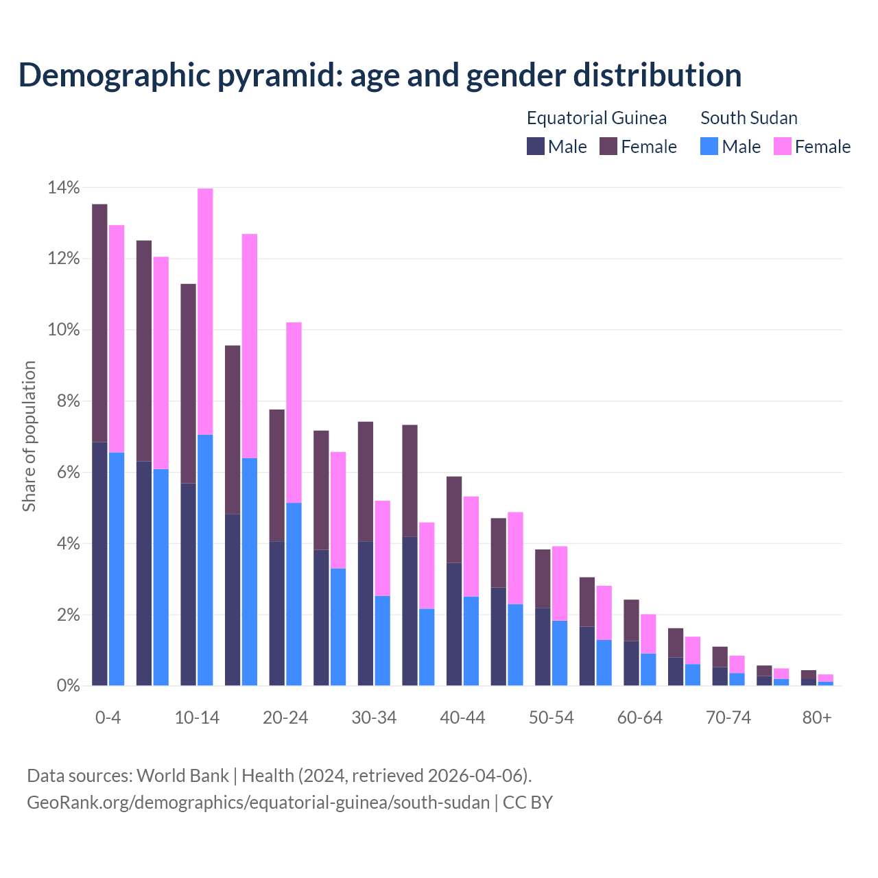 - The share of old-age demographic (65+) in Equatorial Guinea is 3.69% vs 2.99% in South Sudan.