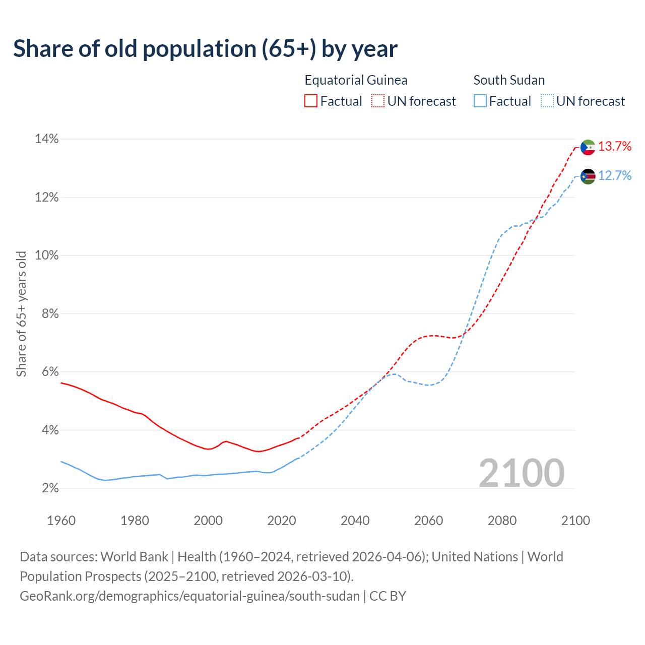 The share of older people aged 65 and over is 3.69% in Equatorial Guinea and 2.99% in South Sudan. Life expectancy in Equatorial Guinea compared to South Sudan .