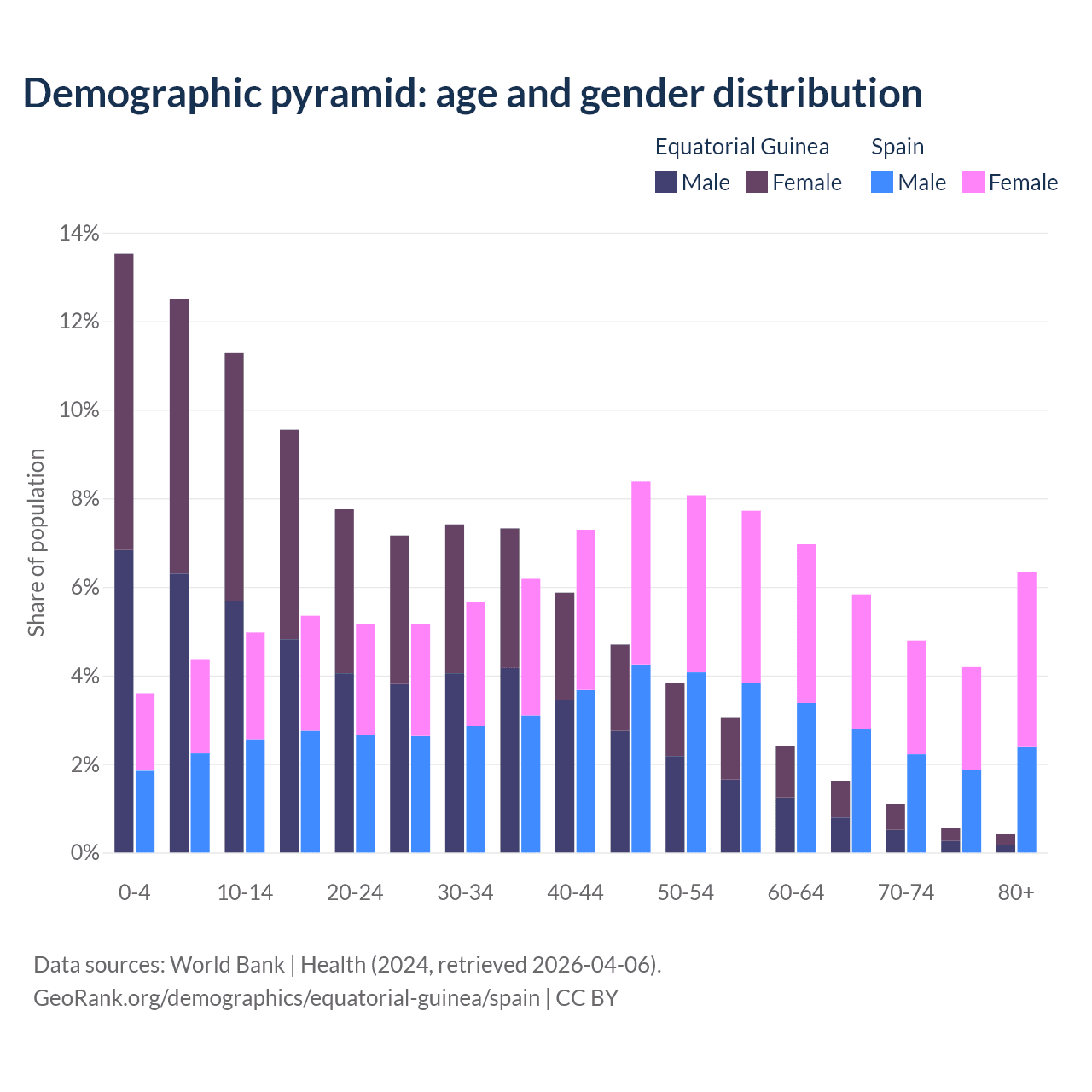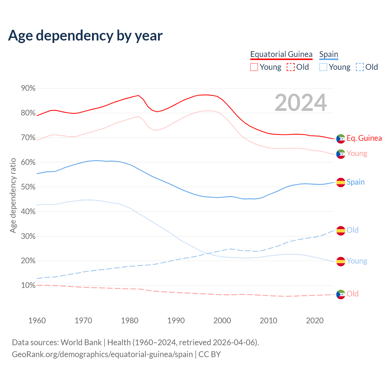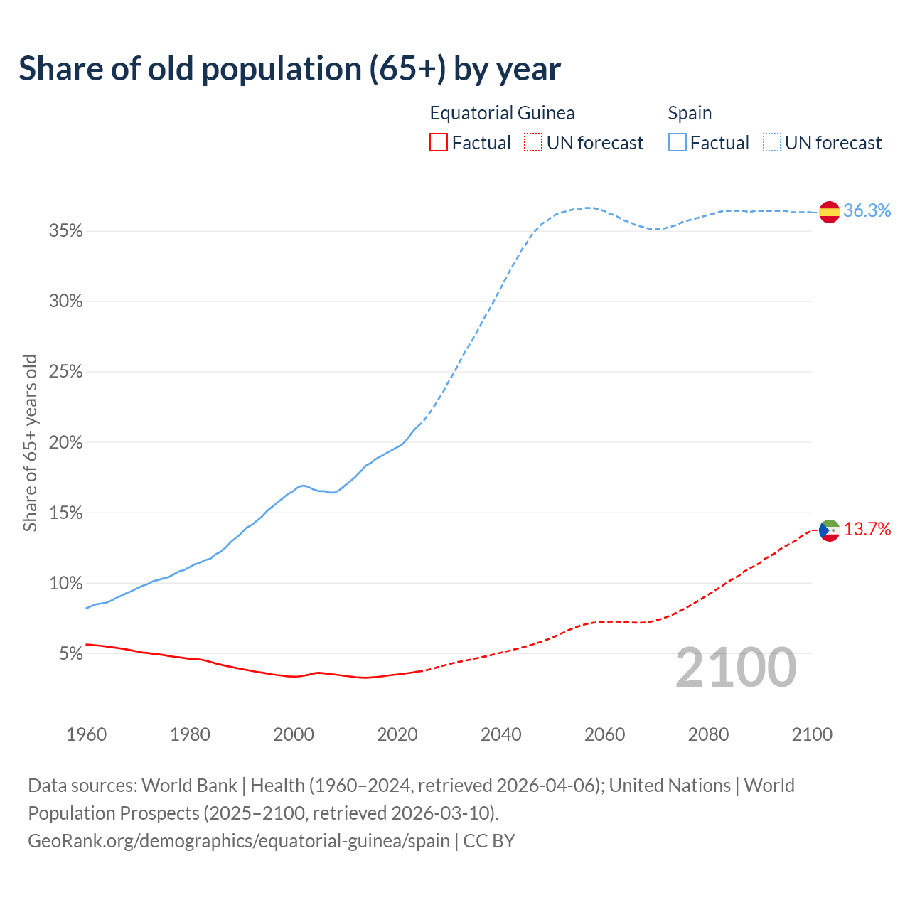 - The share of old-age demographic (65+) in Equatorial Guinea is 3.69% vs 21.1% in Spain.