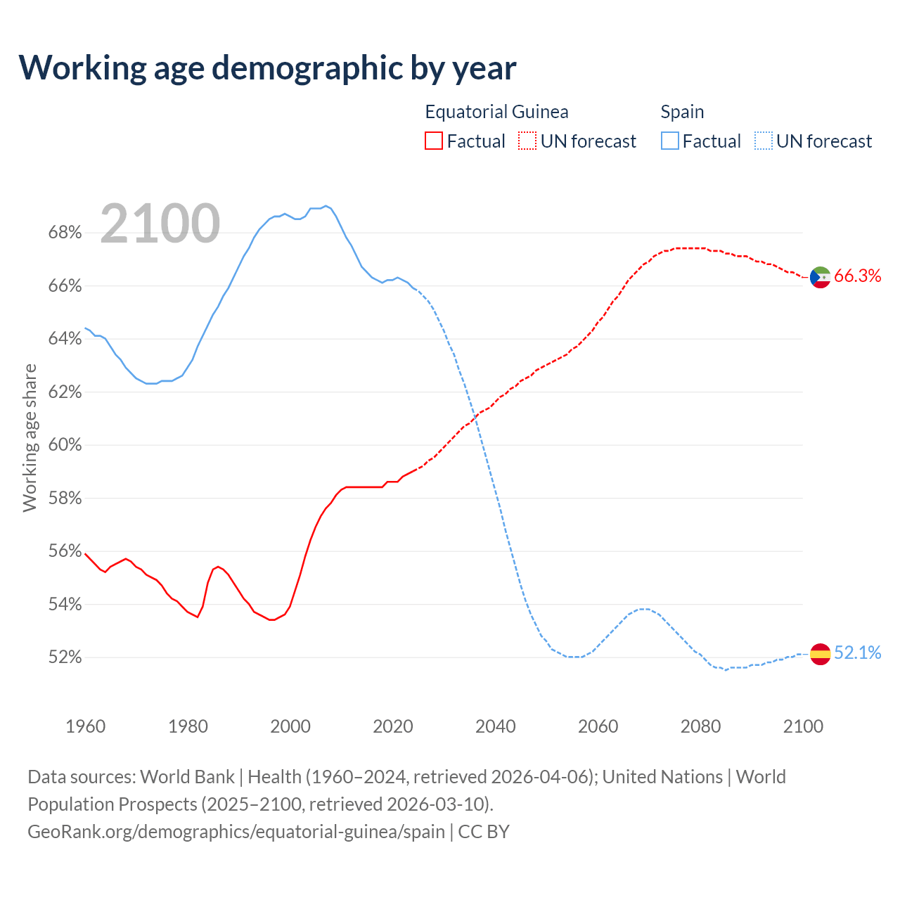- Equatorial Guinea has 1.18M working age adults (aged 15-64) vs 32.2M in Spain.