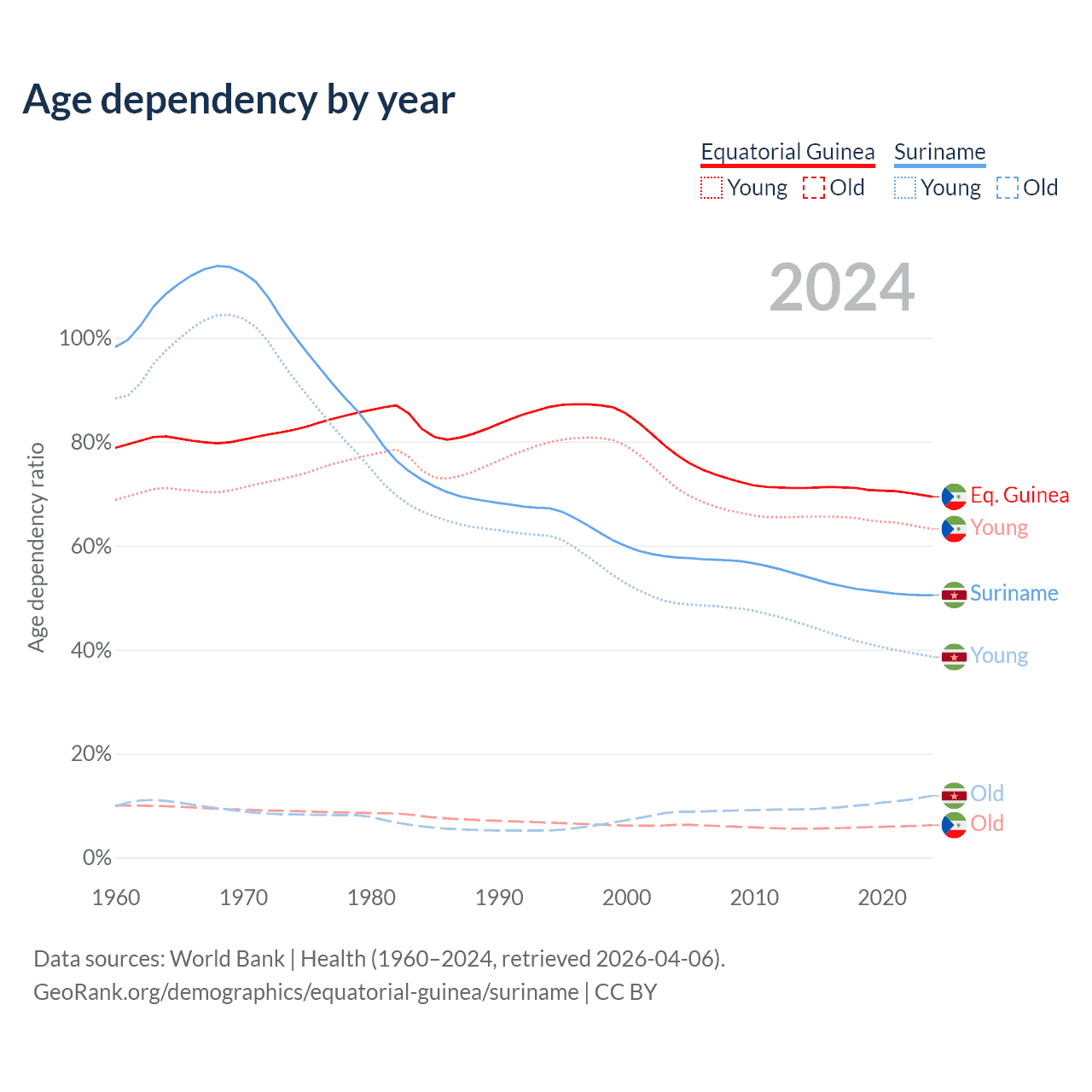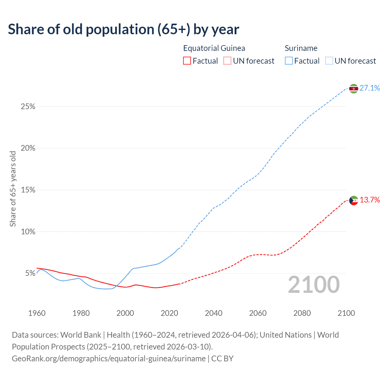 - The share of old-age demographic (65+) in Equatorial Guinea is 3.69% vs 7.9% in Suriname.