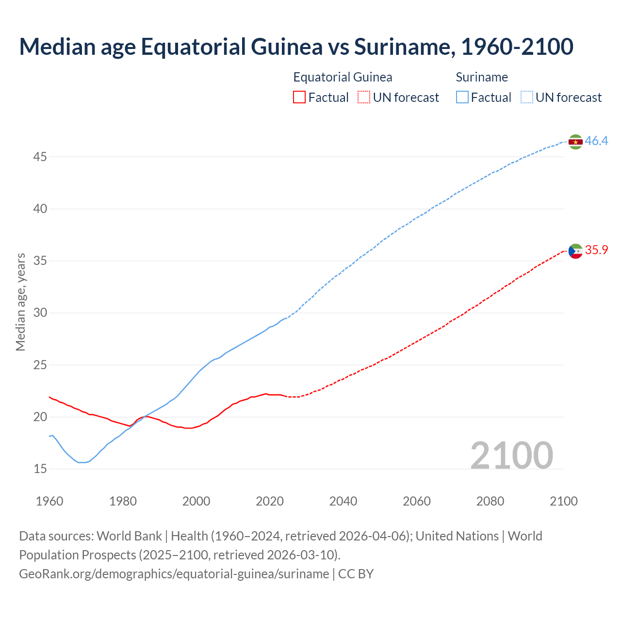 Median age Equatorial Guinea vs Suriname, 1960-2100