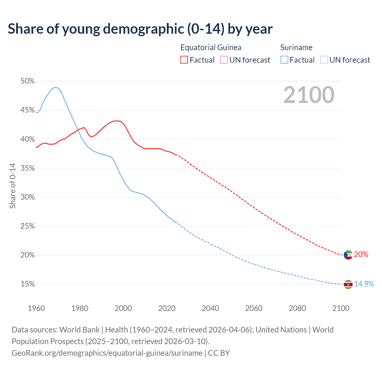 - The share of young demographic (0-15 years old) in Equatorial Guinea is 37.3% vs 25.6% in Suriname.