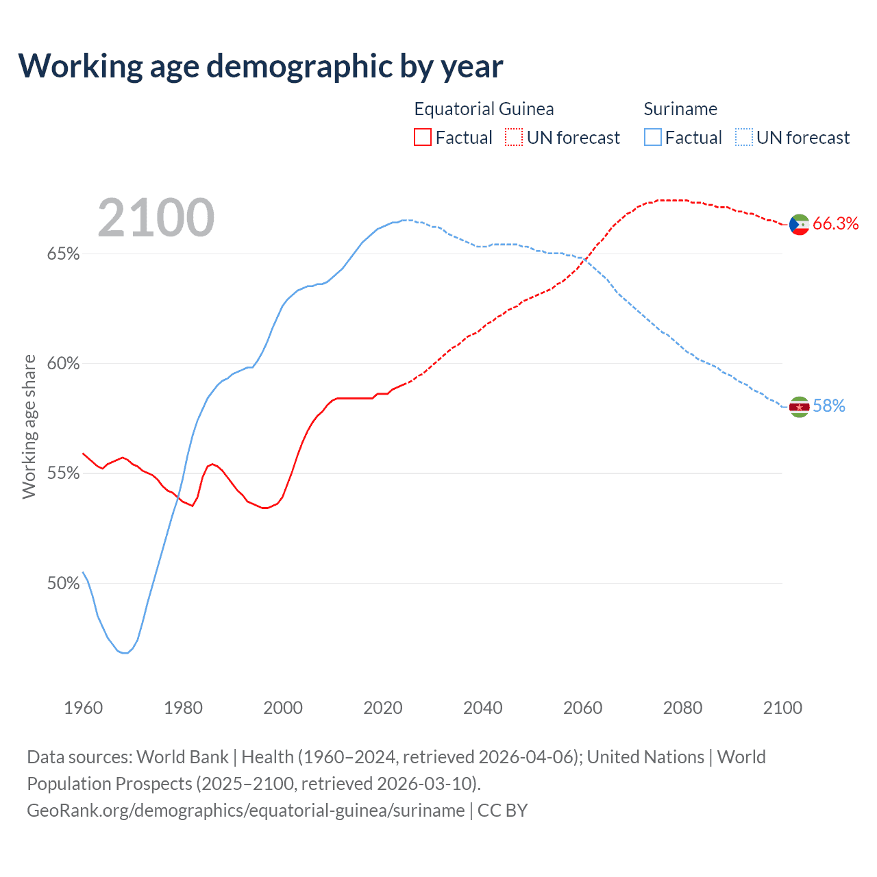 - Equatorial Guinea has 1.18M working age adults (aged 15-64) vs 430K in Suriname.