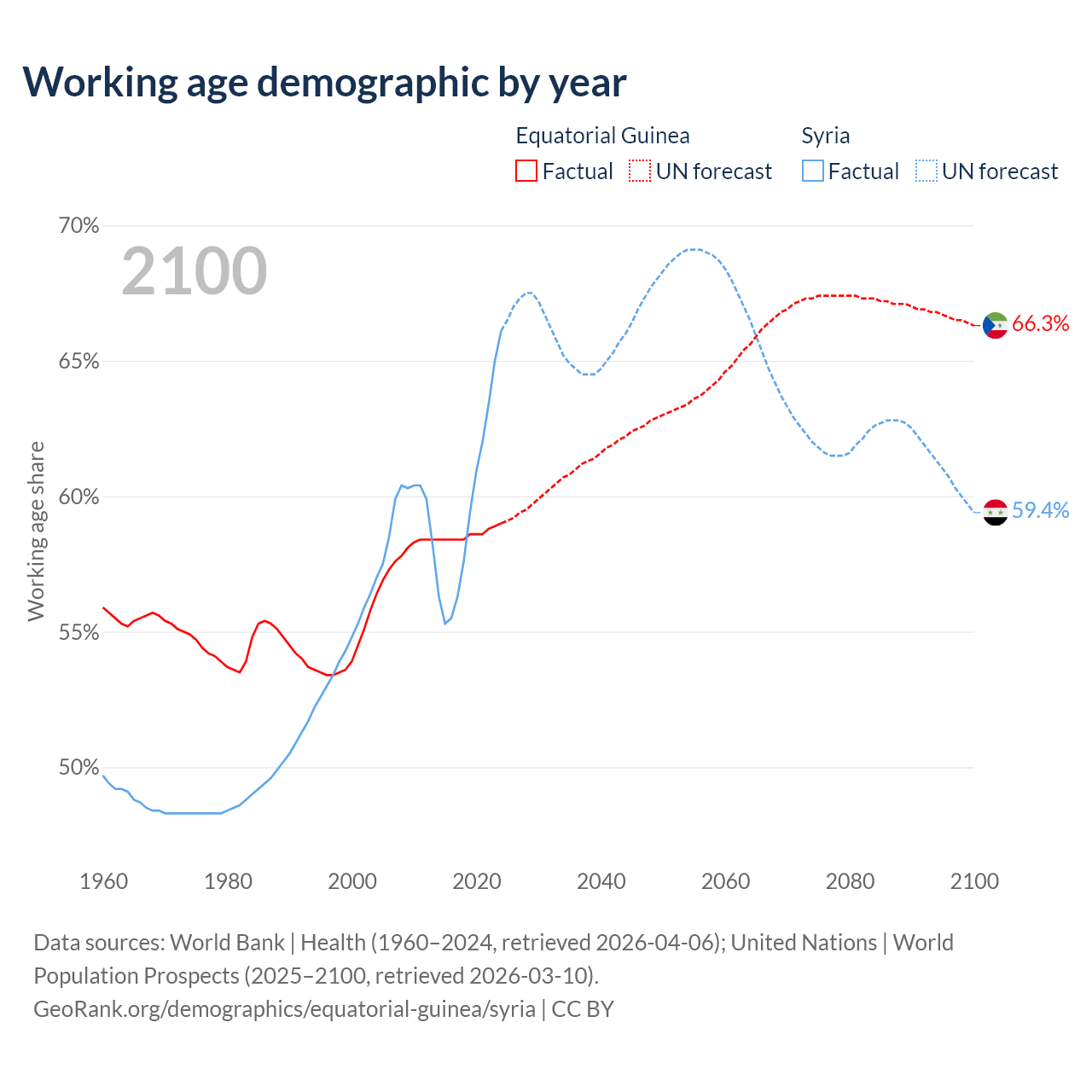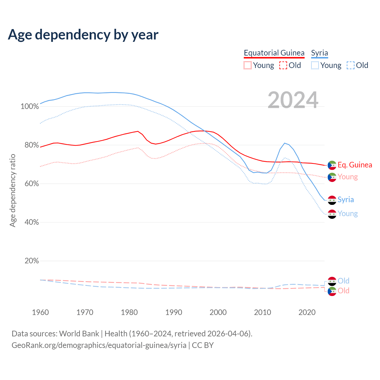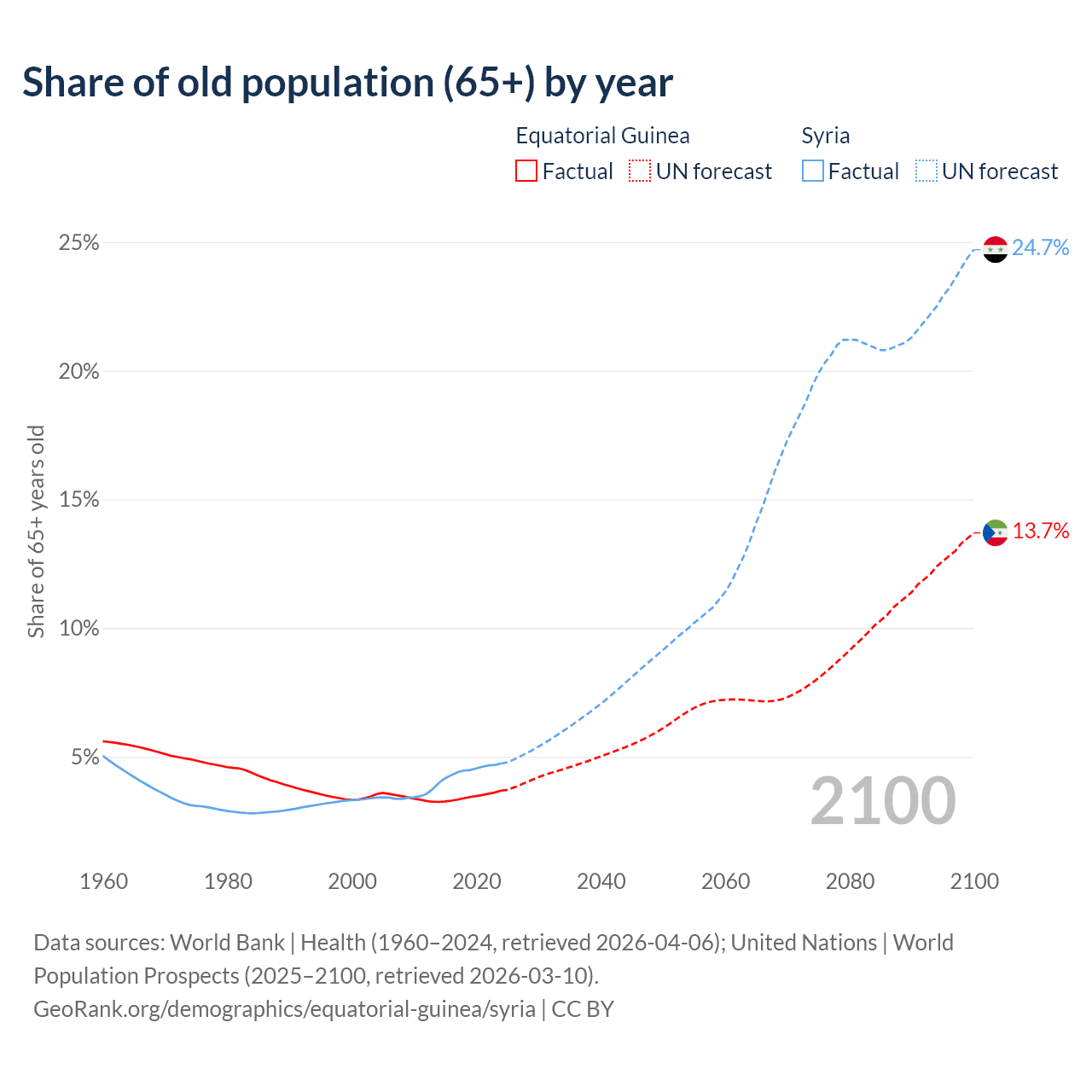 - The share of old-age demographic (65+) in Equatorial Guinea is 3.69% vs 4.74% in Syria.
