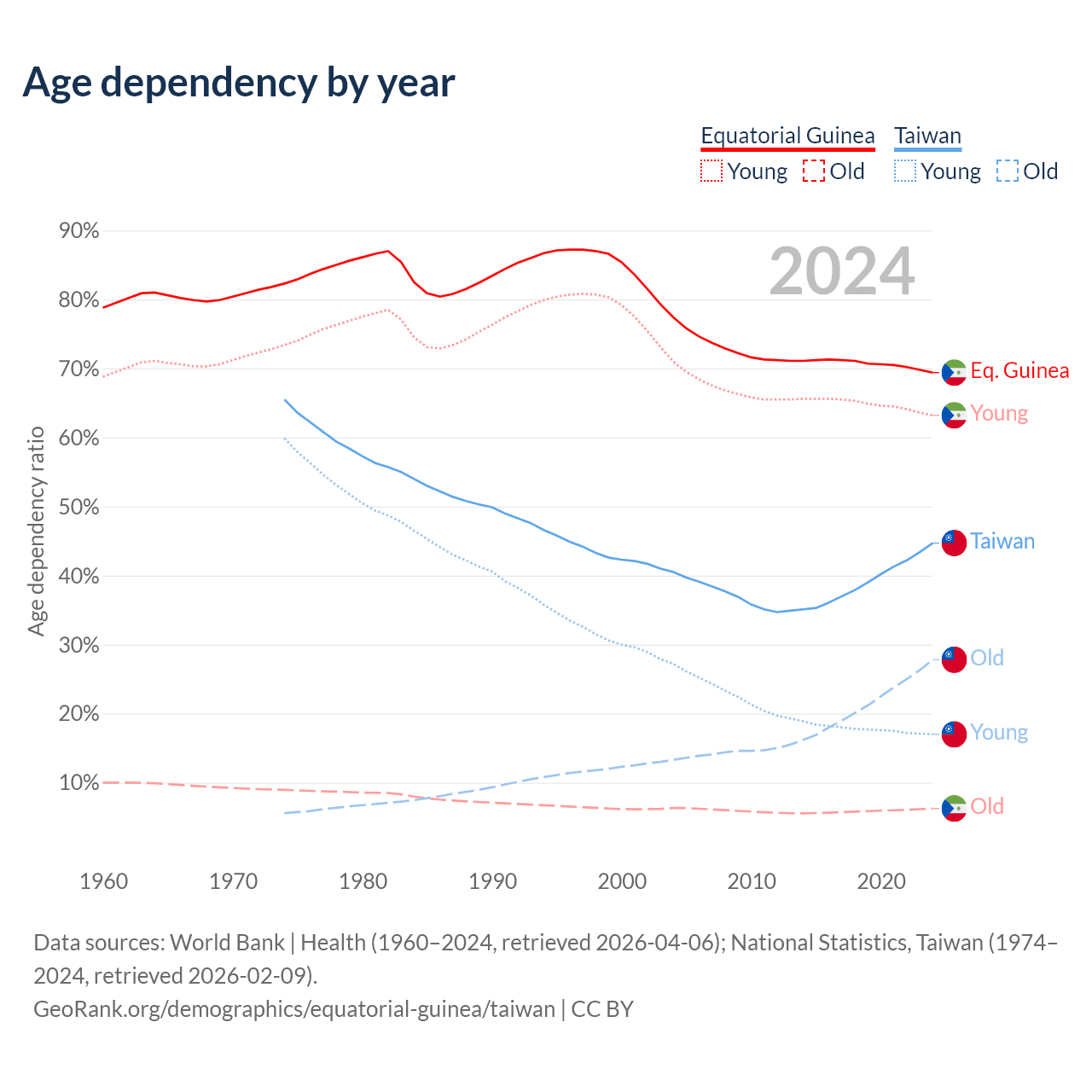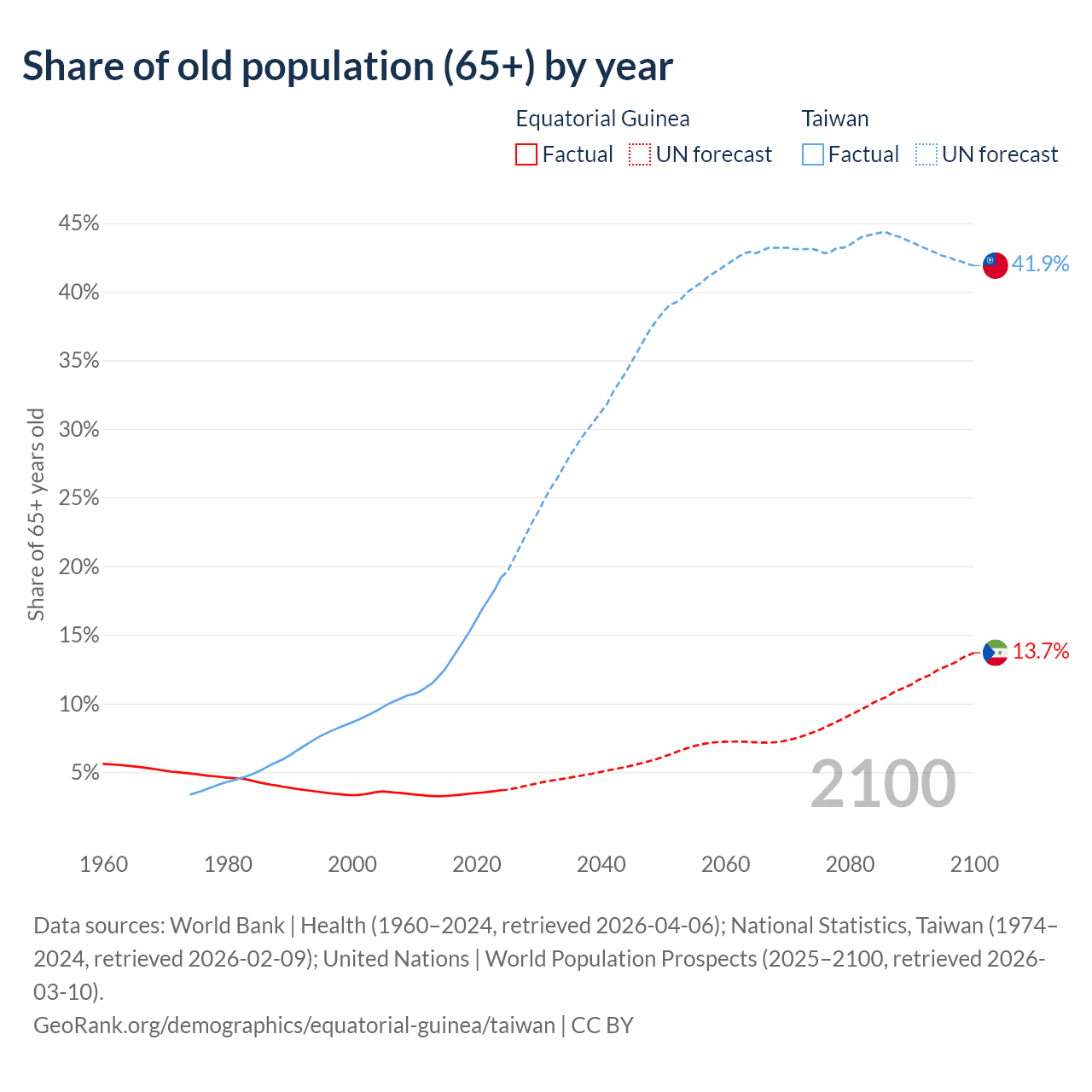 The share of older people aged 65 and over is 3.69% in Equatorial Guinea and 19.2% in Taiwan. Life expectancy in Equatorial Guinea compared to Taiwan .