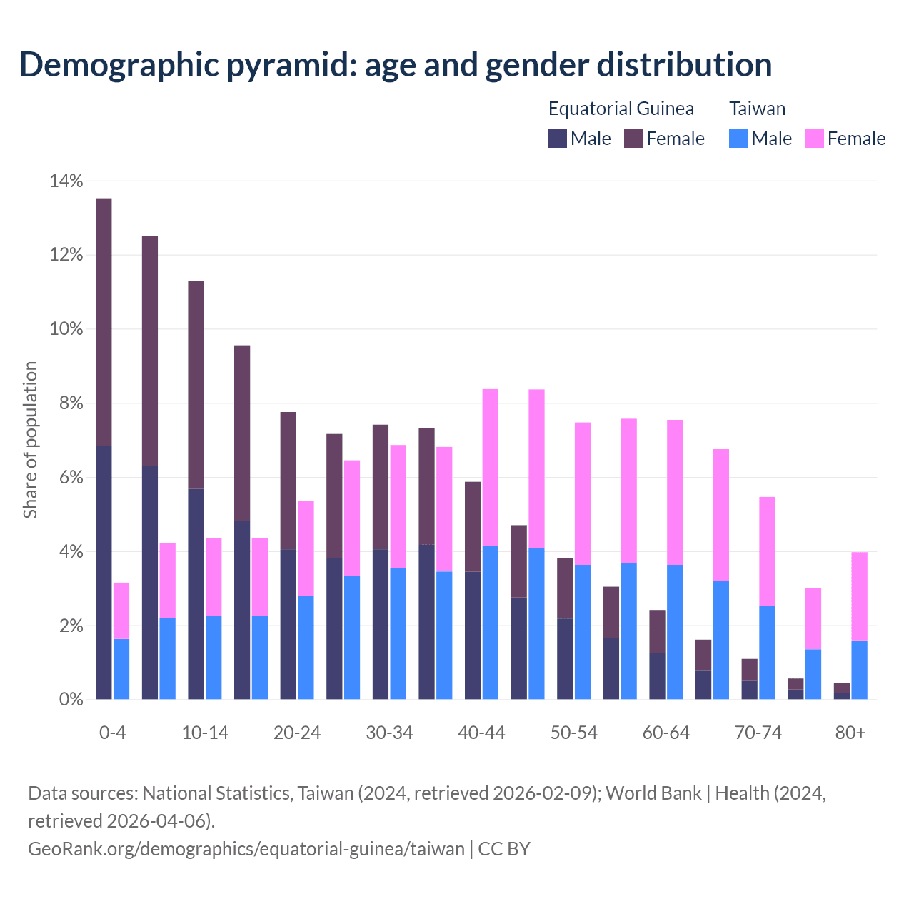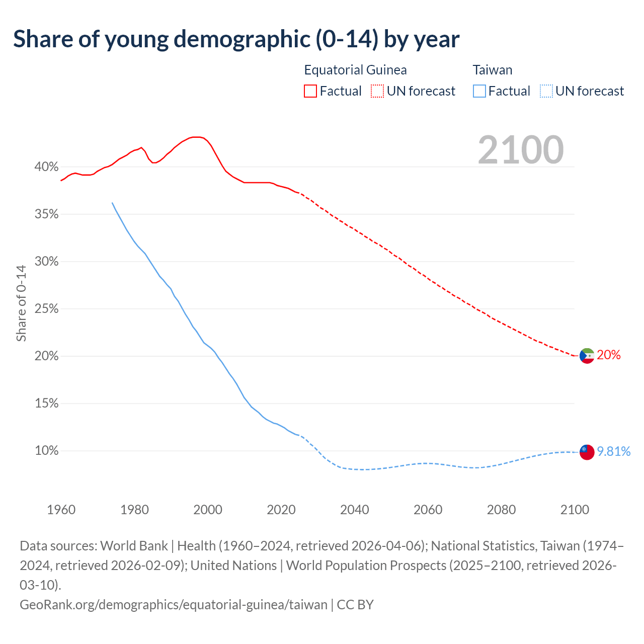 - The share of young demographic (0-15 years old) in Equatorial Guinea is 37.3% vs 11.7% in Taiwan.
