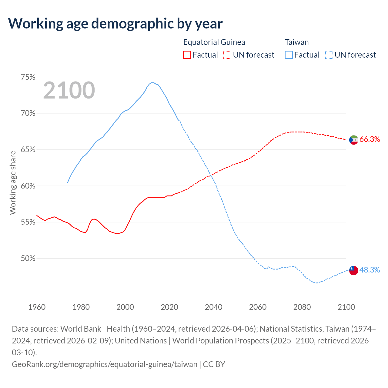 - Equatorial Guinea has 1.18M working age adults (aged 15-64) vs 16.1M in Taiwan.