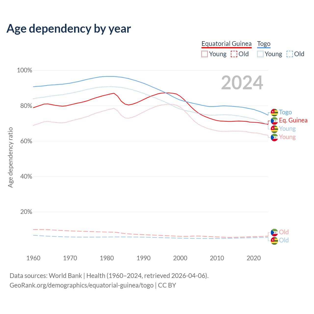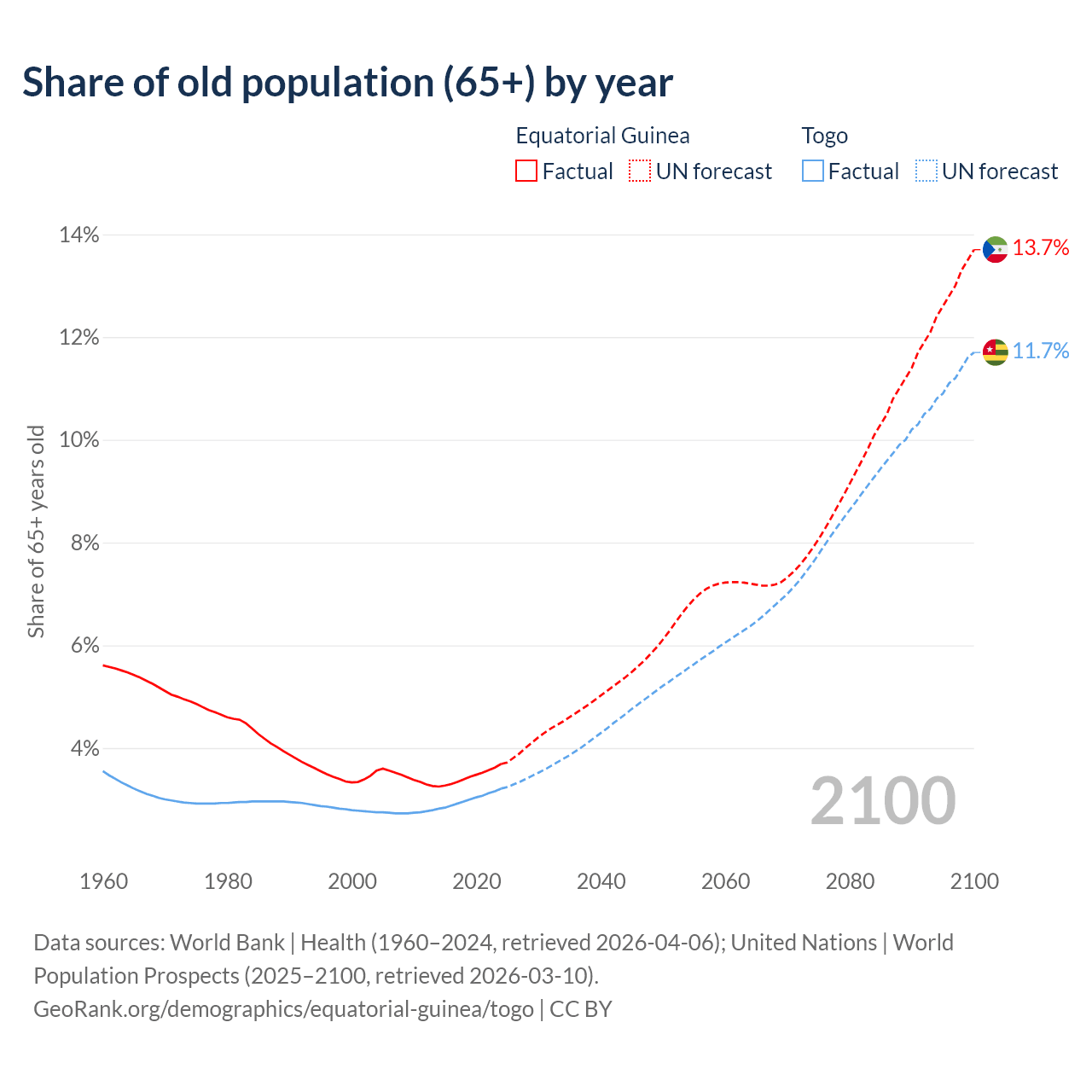 - The share of old-age demographic (65+) in Equatorial Guinea is 3.69% vs 3.21% in Togo.
