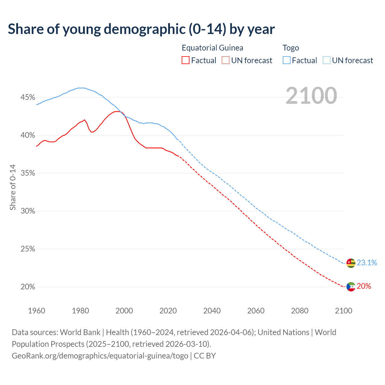 - The share of young demographic (0-15 years old) in Equatorial Guinea is 37.3% vs 39.5% in Togo.
