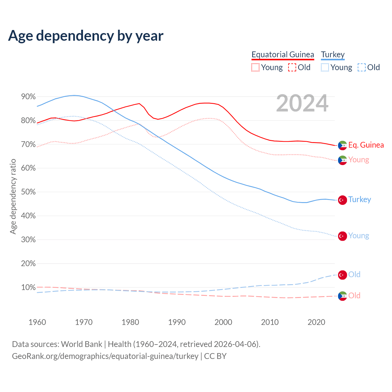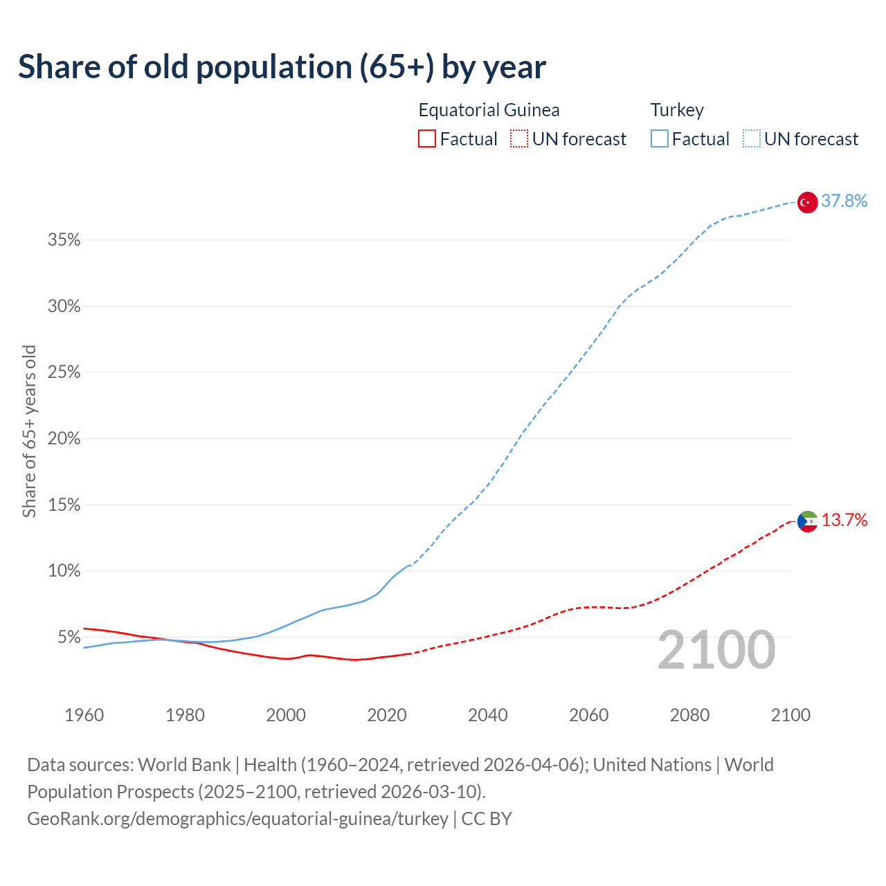 The share of older people aged 65 and over is 3.69% in Equatorial Guinea and 10.3% in Turkey. Life expectancy in Equatorial Guinea compared to Turkey .