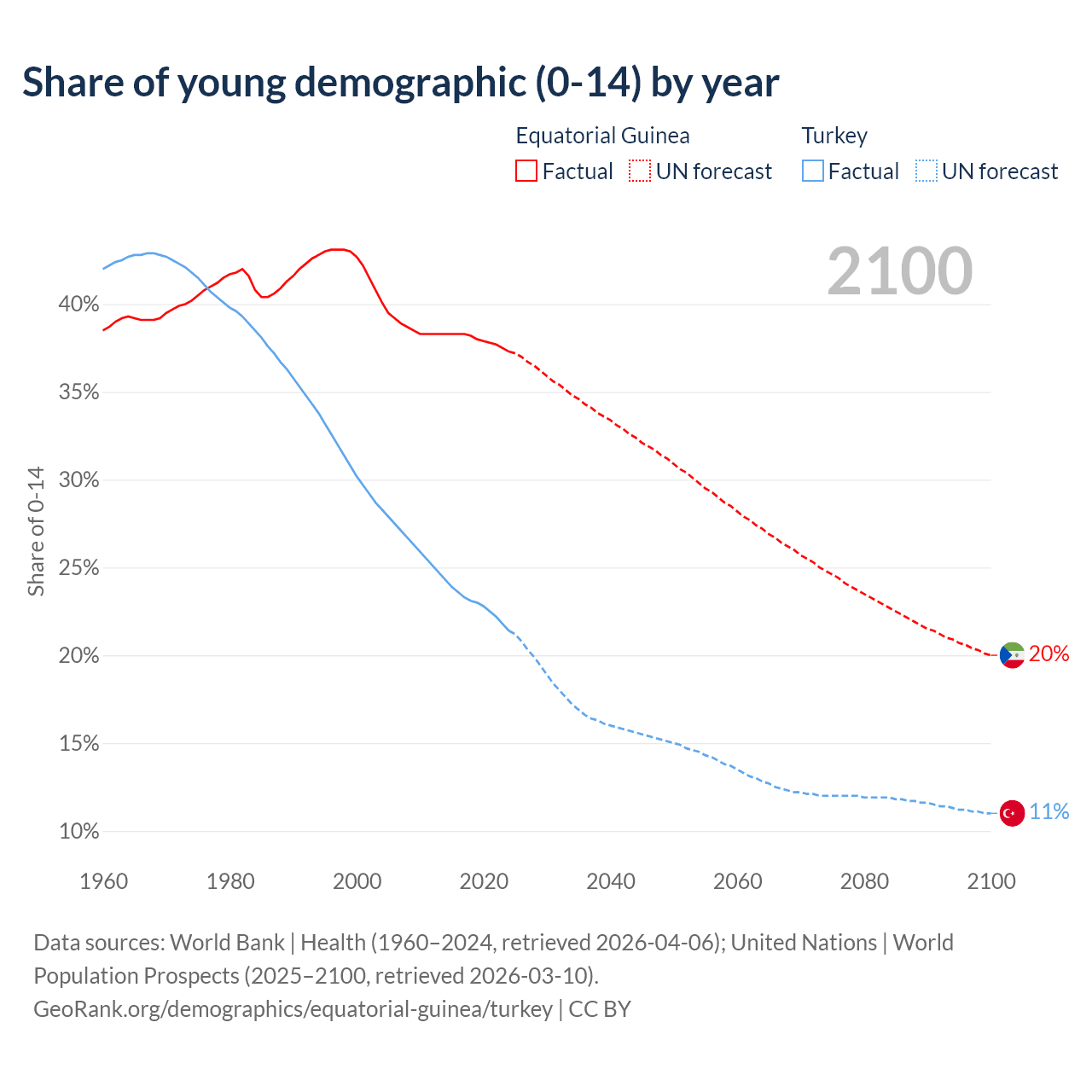 - The share of young demographic (0-15 years old) in Equatorial Guinea is 37.3% vs 21.4% in Turkey.