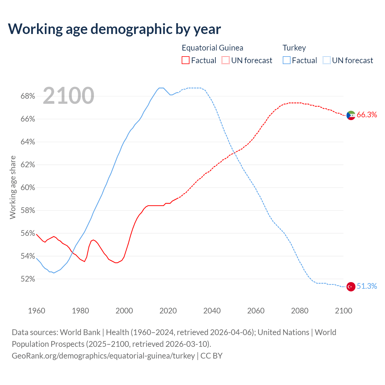 - Equatorial Guinea has 1.18M working age adults (aged 15-64) vs 58.7M in Turkey.