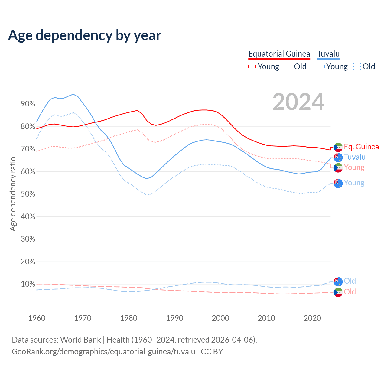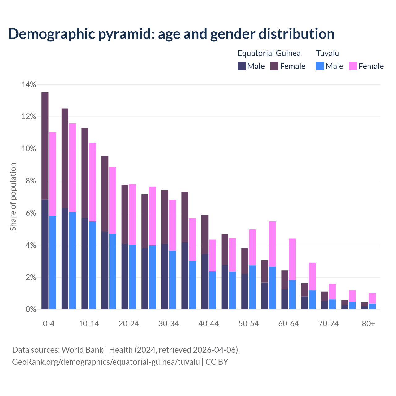 - The share of old-age demographic (65+) in Equatorial Guinea is 3.69% vs 6.67% in Tuvalu.