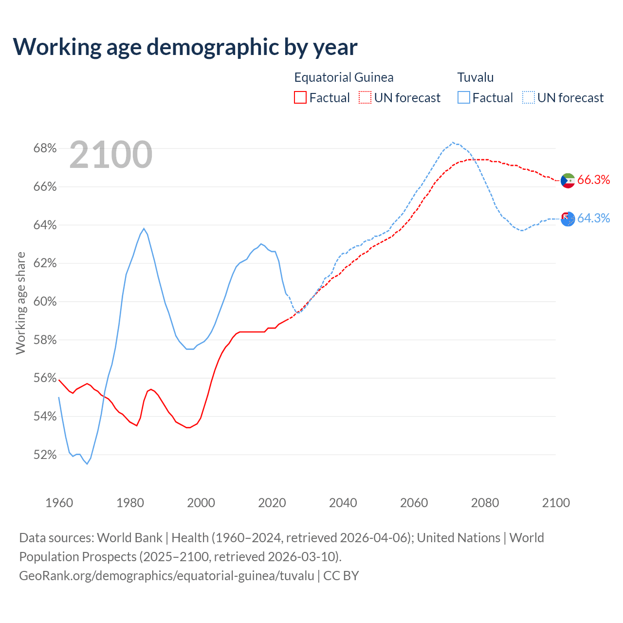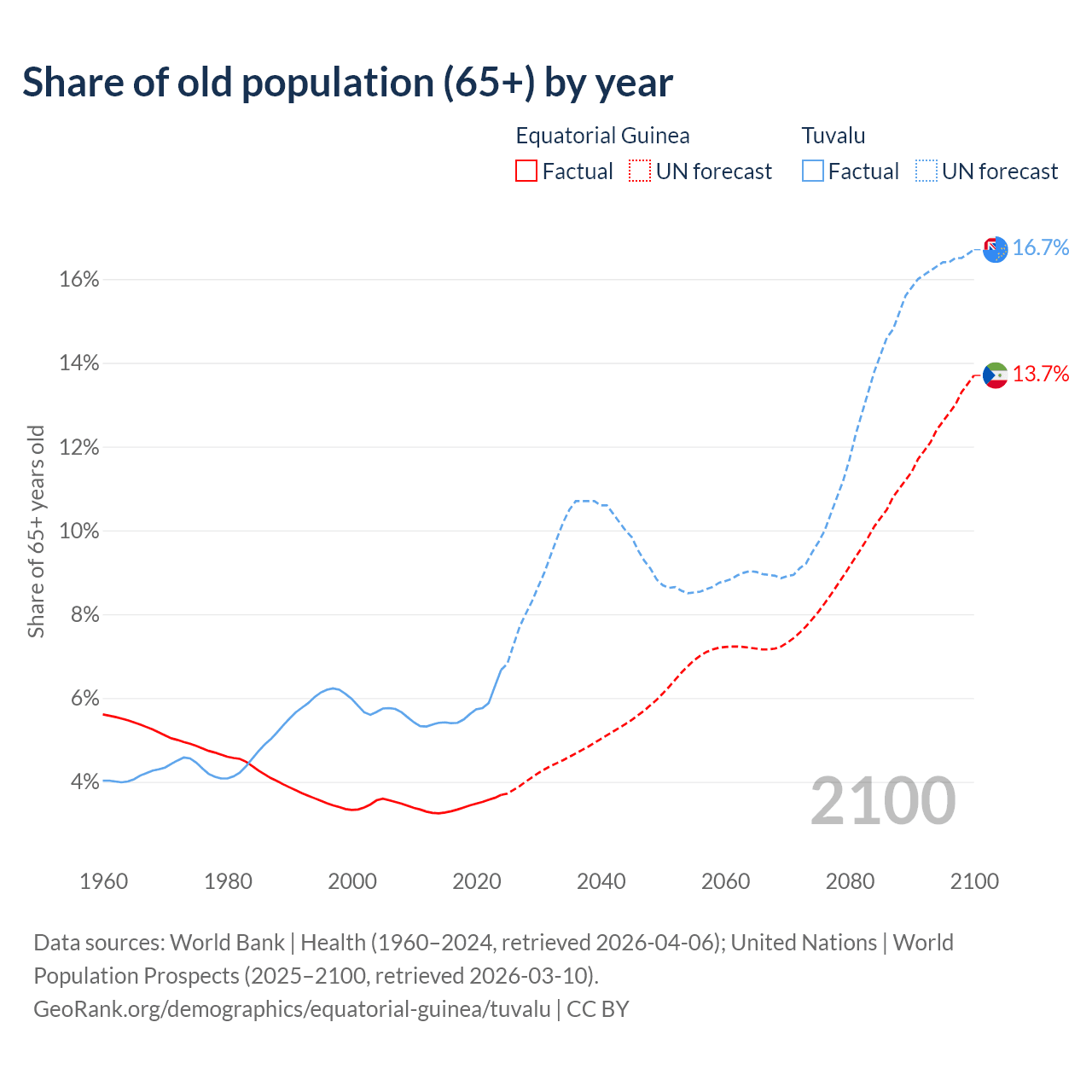 The share of older people aged 65 and over is 3.69% in Equatorial Guinea and 6.67% in Tuvalu. Life expectancy in Equatorial Guinea compared to Tuvalu .