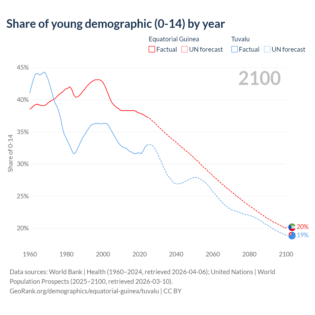 - The share of young demographic (0-15 years old) in Equatorial Guinea is 37.3% vs 32.9% in Tuvalu.