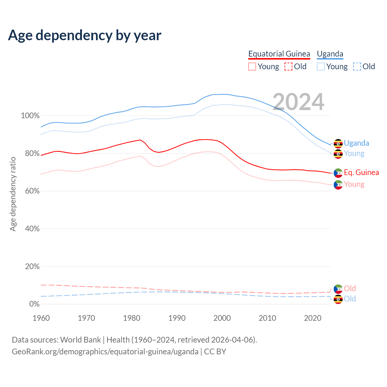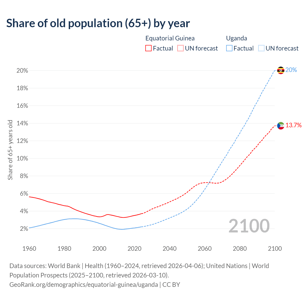 - The share of old-age demographic (65+) in Equatorial Guinea is 3.69% vs 2.19% in Uganda.
