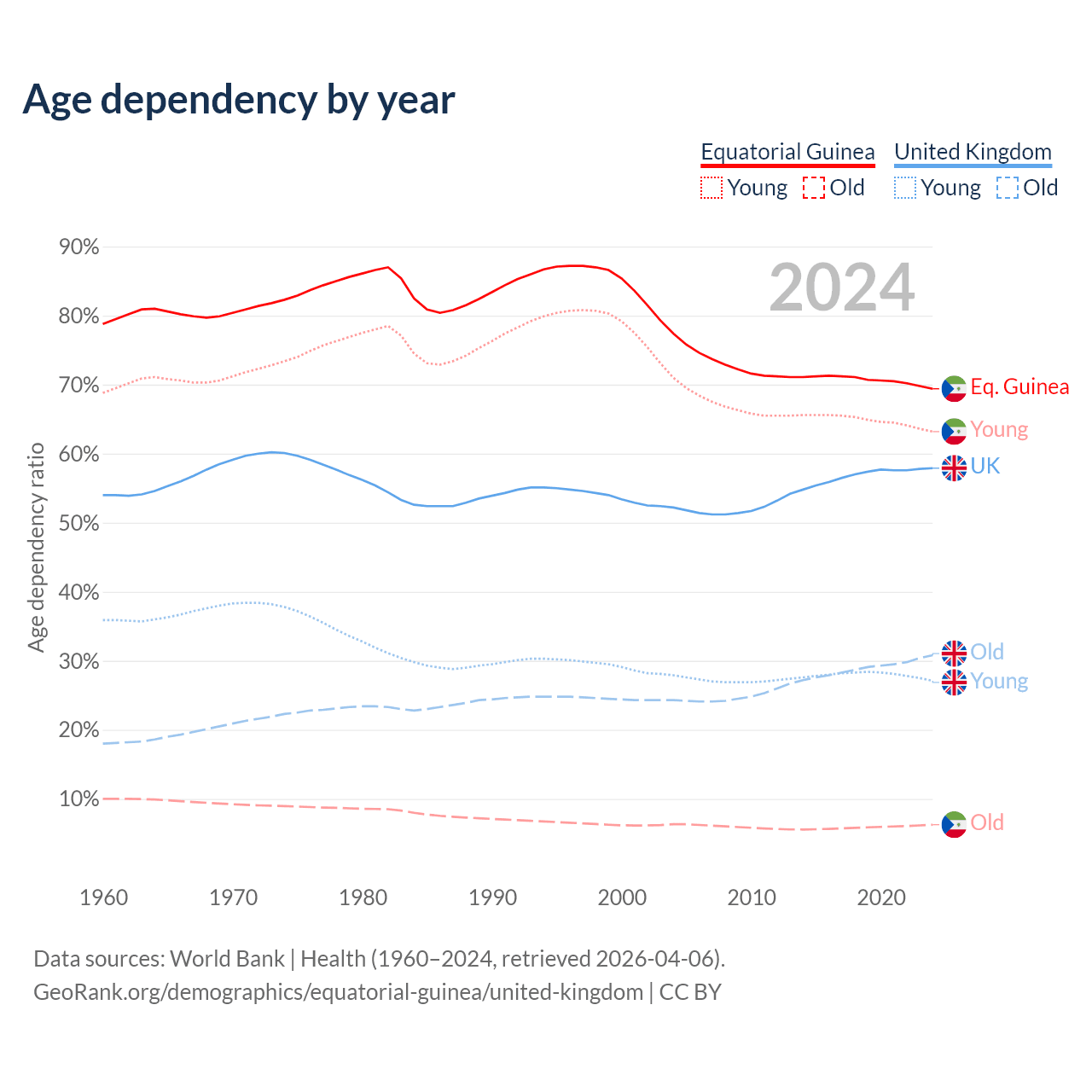 Data sources: World Bank | Health (1960–2024, retrieved 2026-04-06); U.S. Census Bureau (1960–2024, retrieved 2026-02-08).