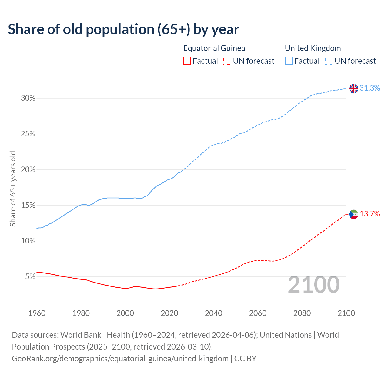 The share of older people aged 65 and over is 3.69% in Equatorial Guinea and 19.5% in the United Kingdom. Life expectancy in Equatorial Guinea compared to the United Kingdom .