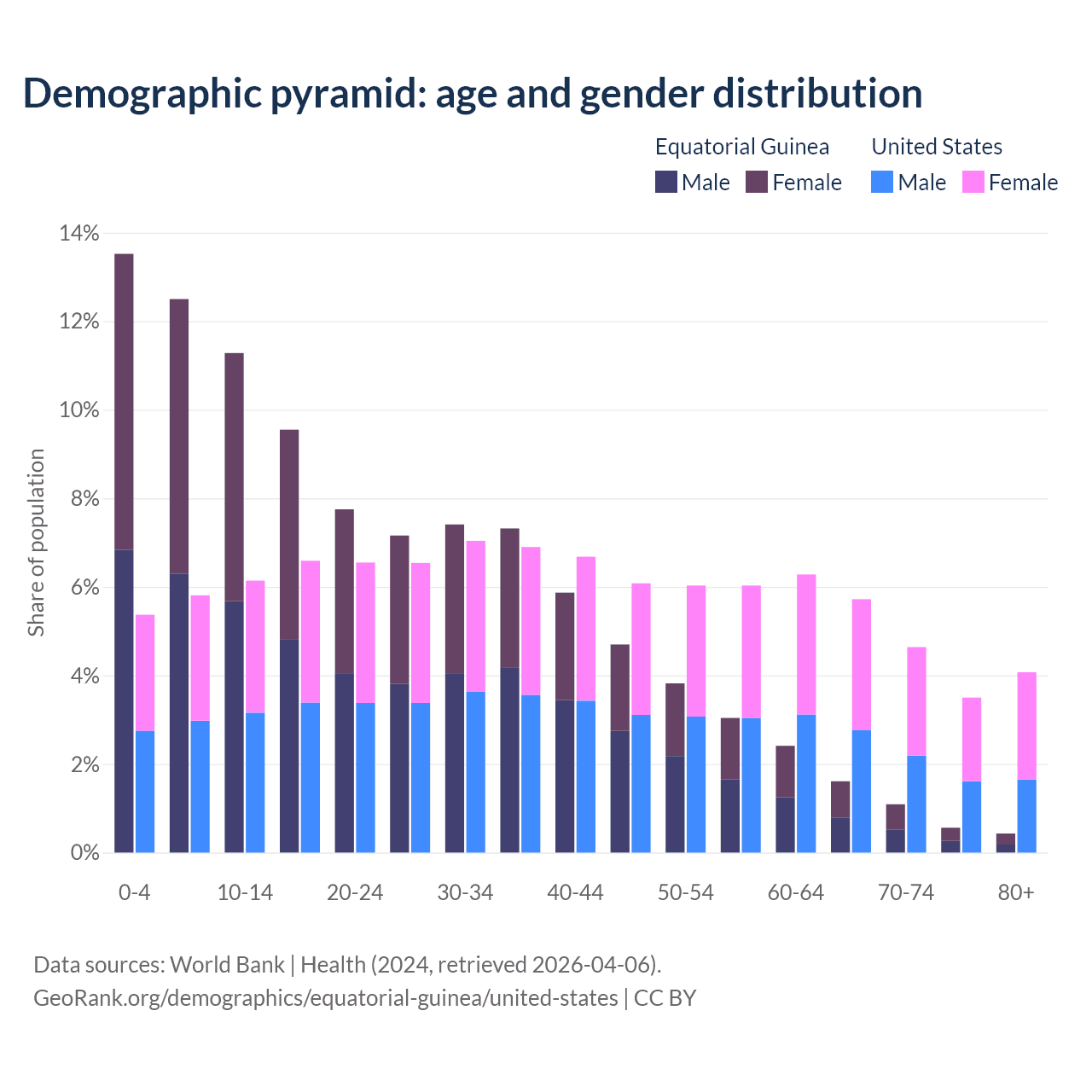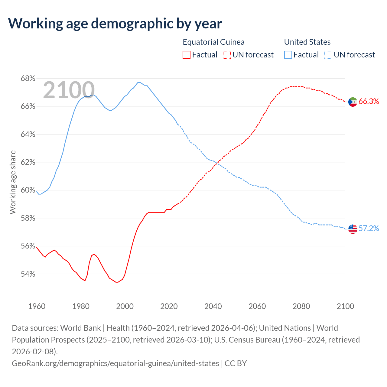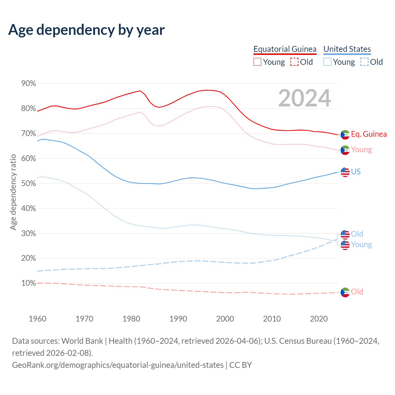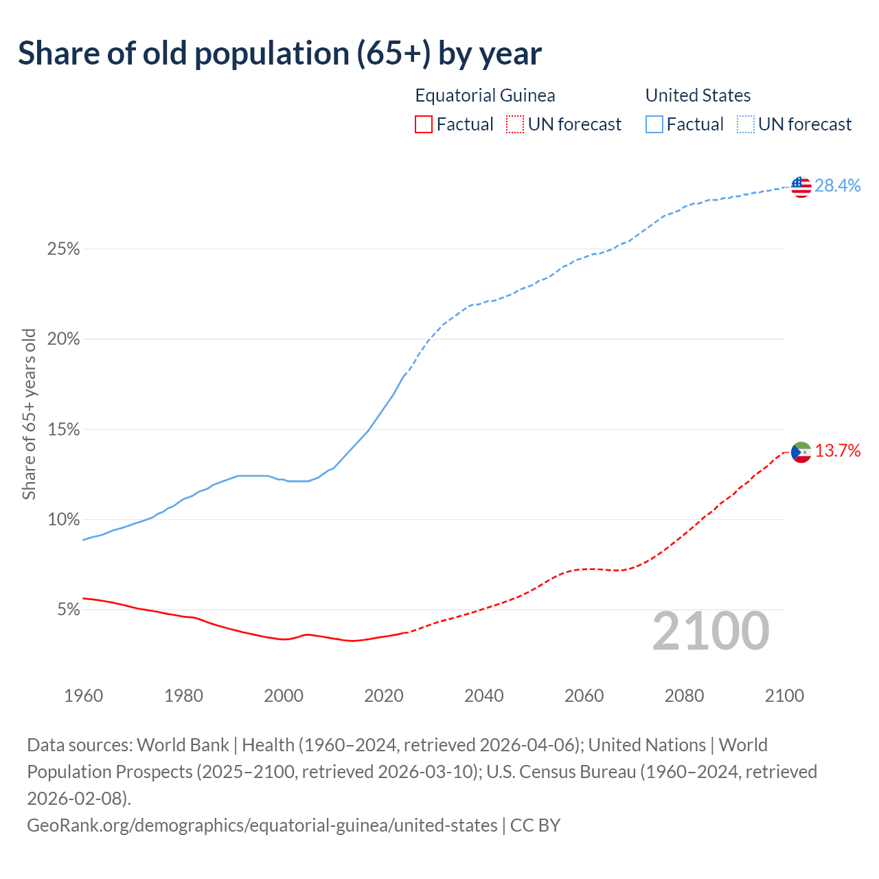 - The share of old-age demographic (65+) in Equatorial Guinea is 3.69% vs 17.9% in the United States.