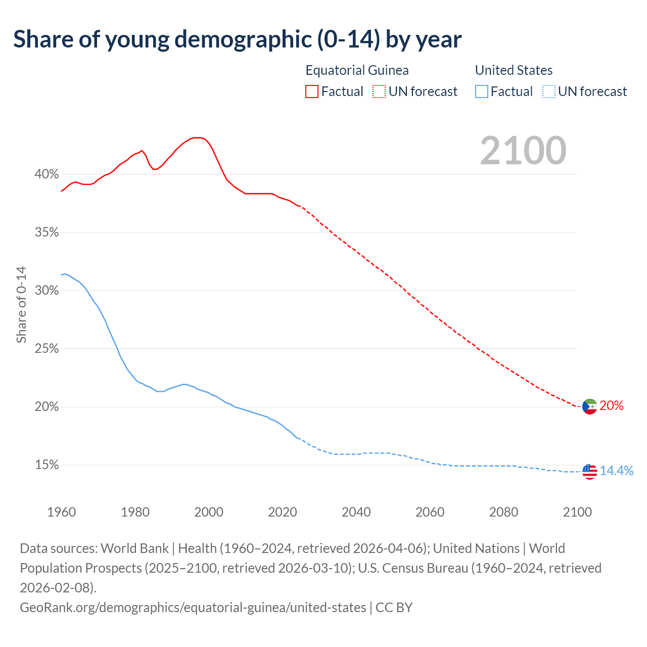 - The share of young demographic (0-15 years old) in Equatorial Guinea is 37.3% vs 17.3% in the United States.