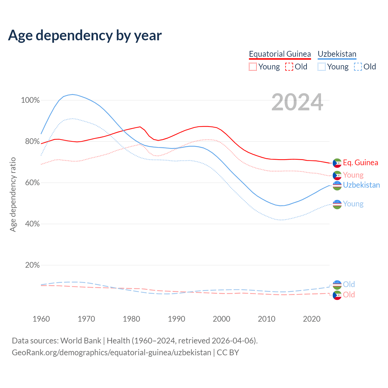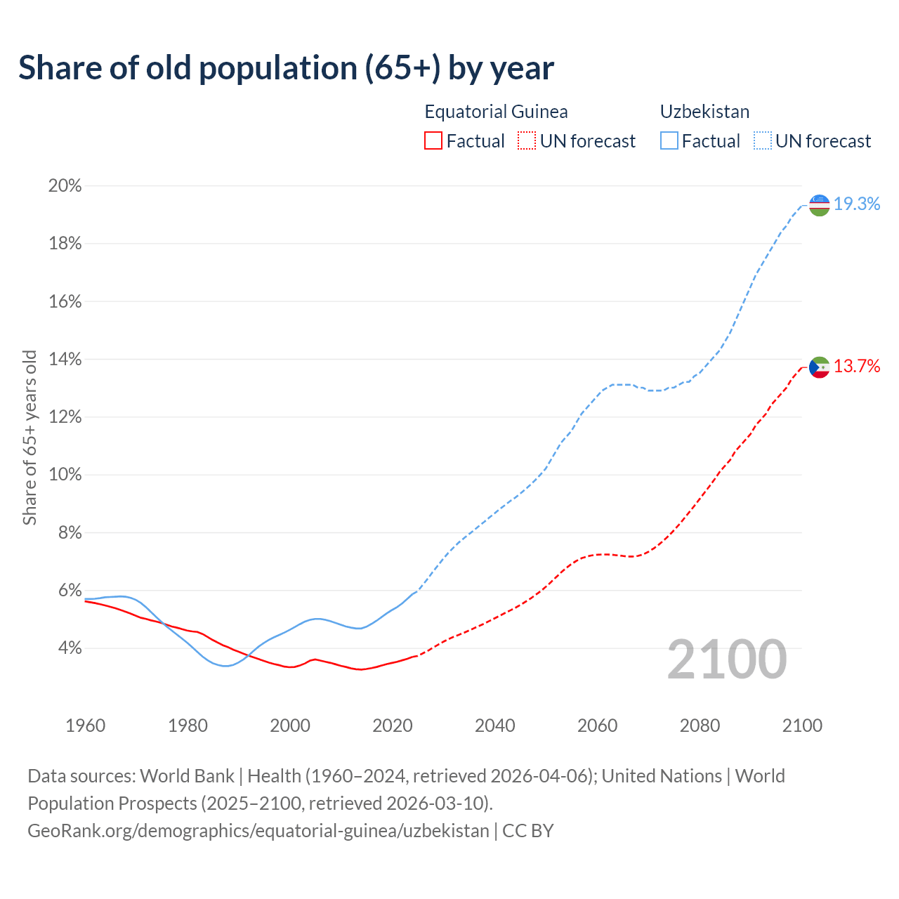 The share of older people aged 65 and over is 3.69% in Equatorial Guinea and 5.86% in Uzbekistan. Life expectancy in Equatorial Guinea compared to Uzbekistan .