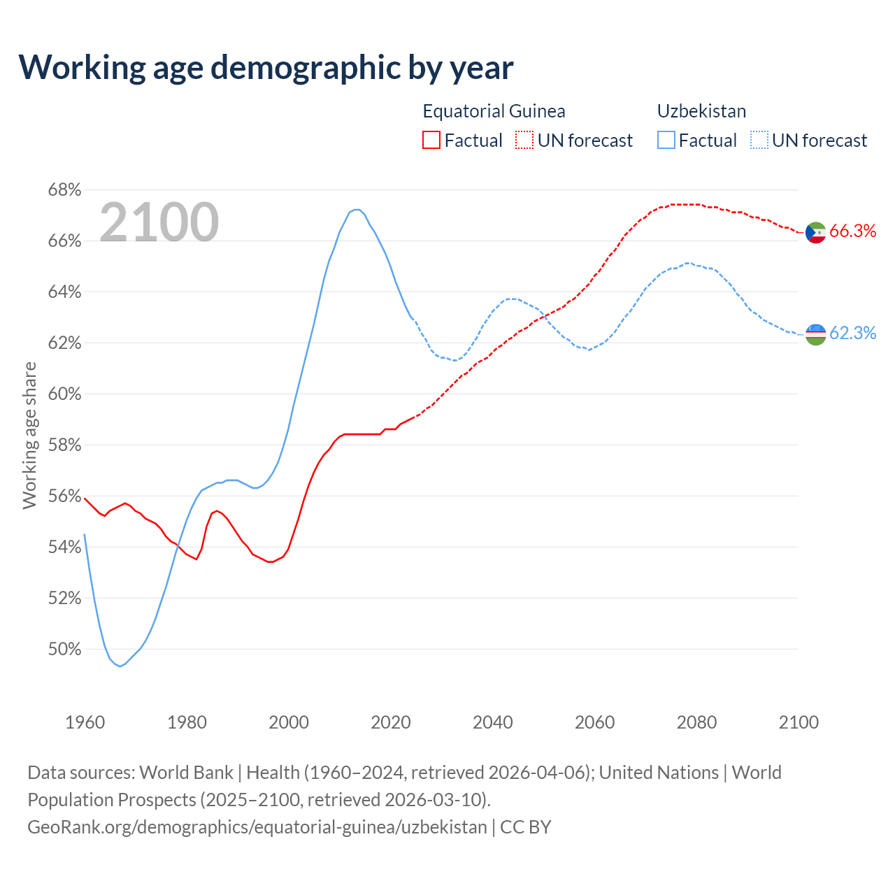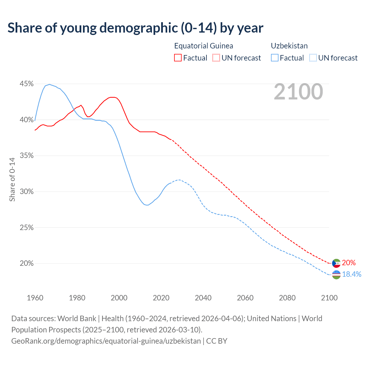 Median age Equatorial Guinea vs Uzbekistan, 1960-2100