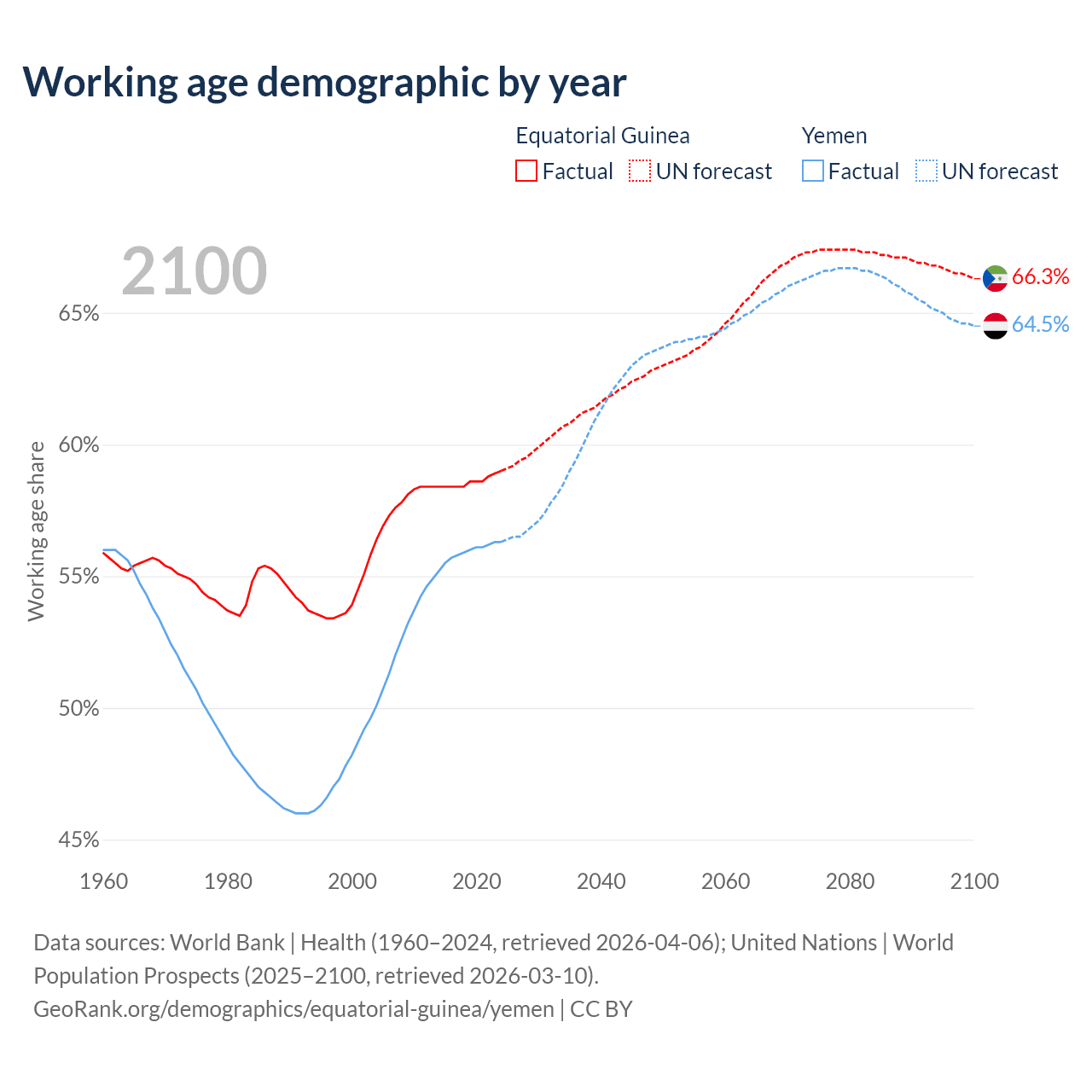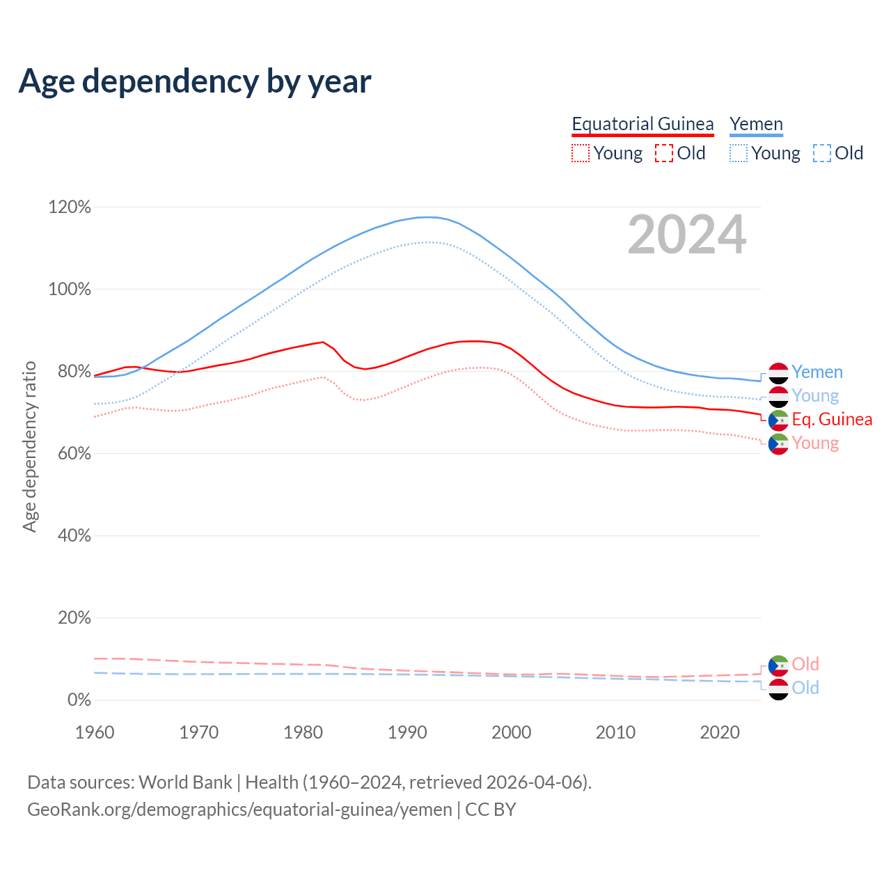 - The share of old-age demographic (65+) in Equatorial Guinea is 3.69% vs 2.52% in Yemen.