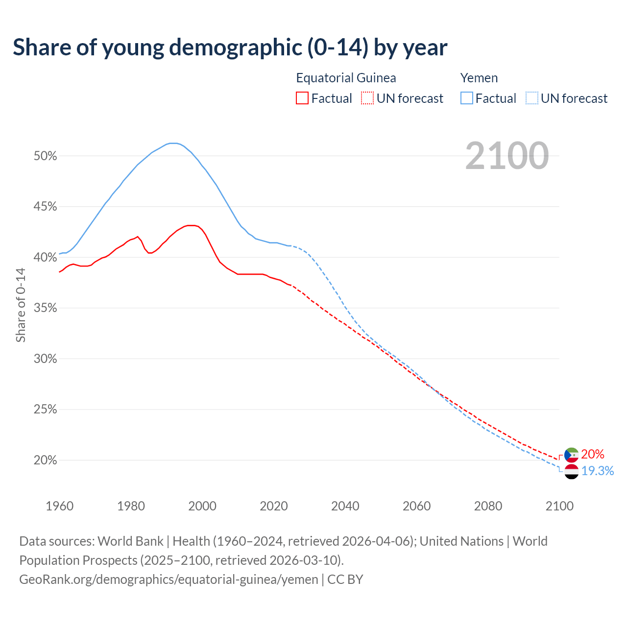 - The share of young demographic (0-15 years old) in Equatorial Guinea is 37.3% vs 41.1% in Yemen.