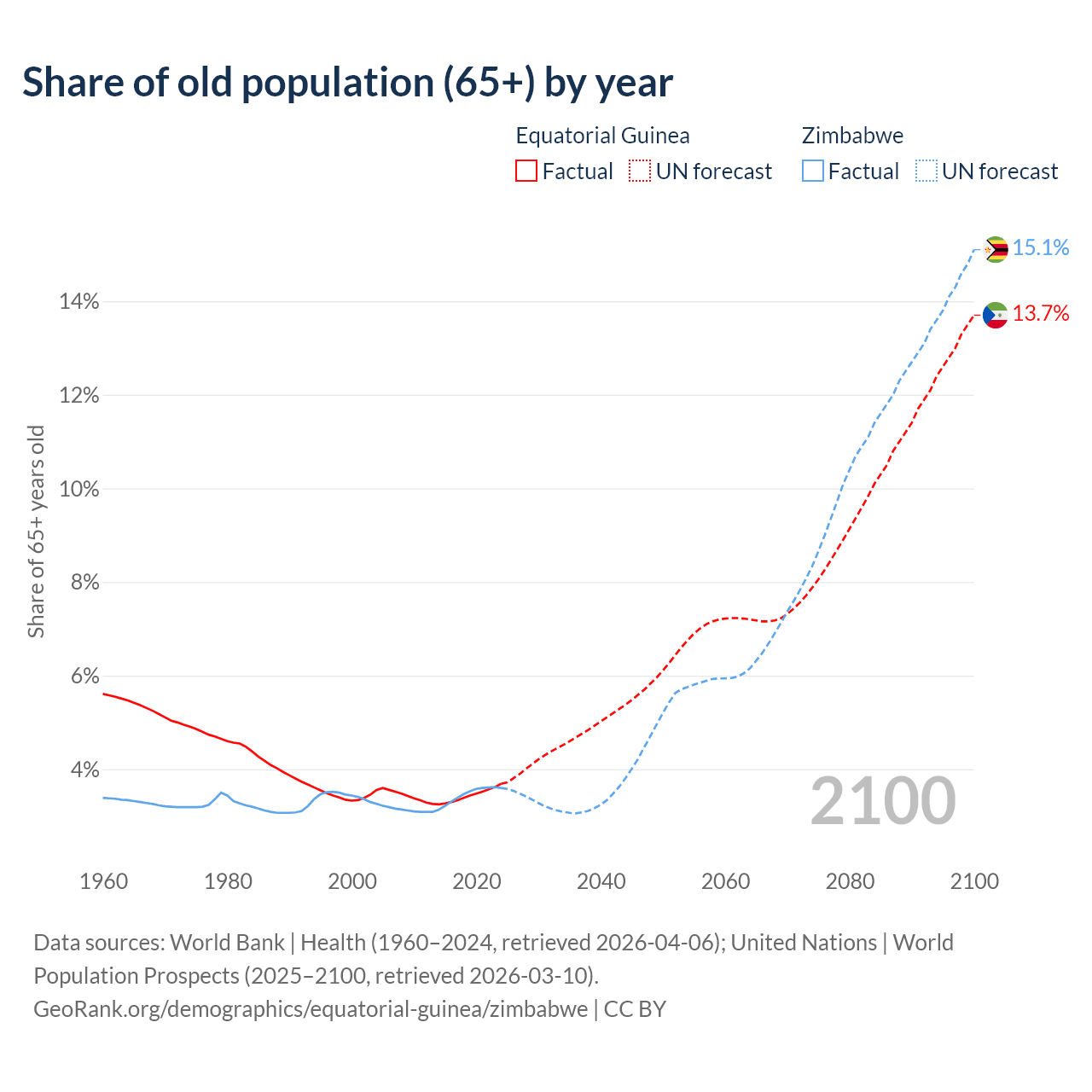 The share of older people aged 65 and over is 3.69% in Equatorial Guinea and 3.6% in Zimbabwe. Life expectancy in Equatorial Guinea compared to Zimbabwe .