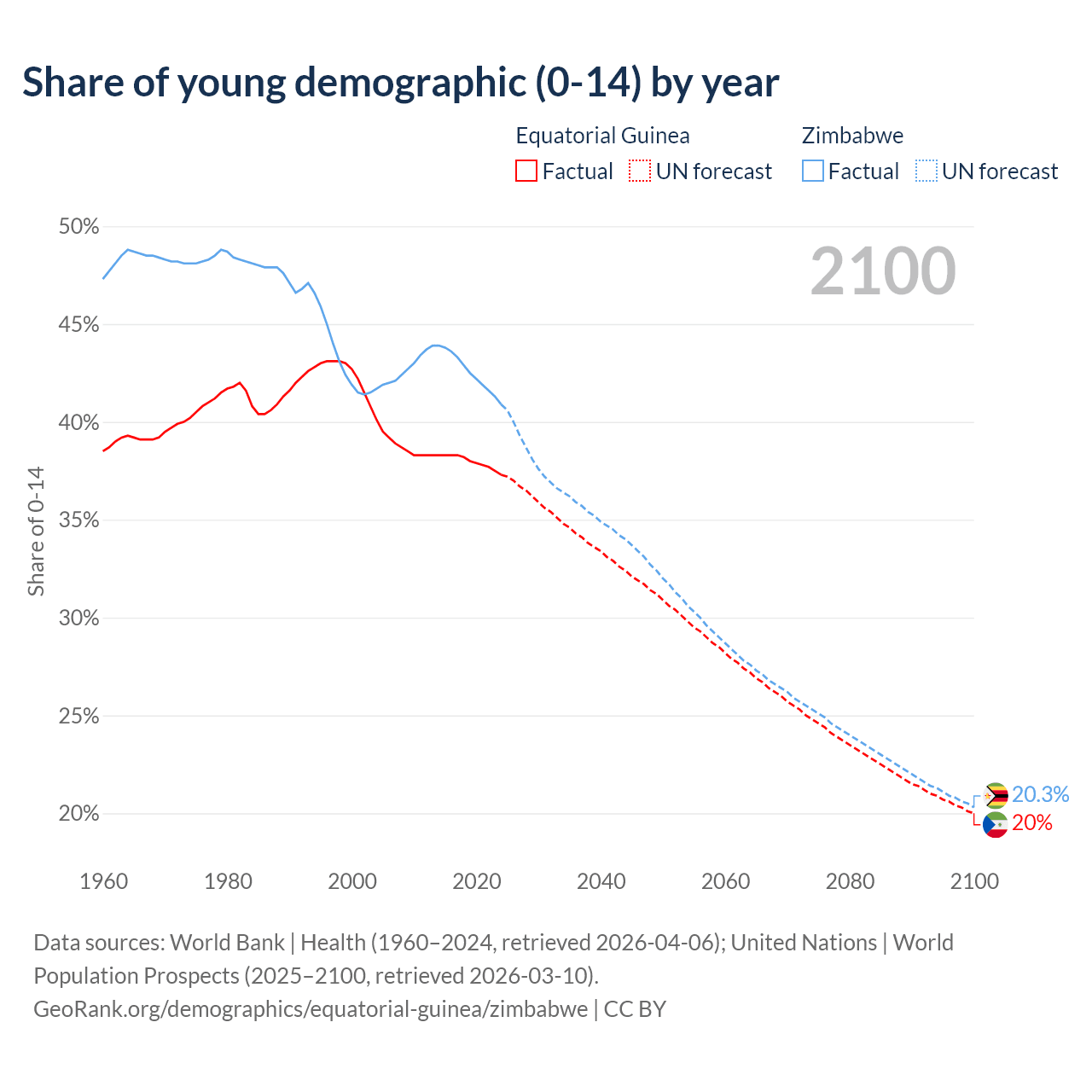 - The share of young demographic (0-15 years old) in Equatorial Guinea is 37.3% vs 40.9% in Zimbabwe.
