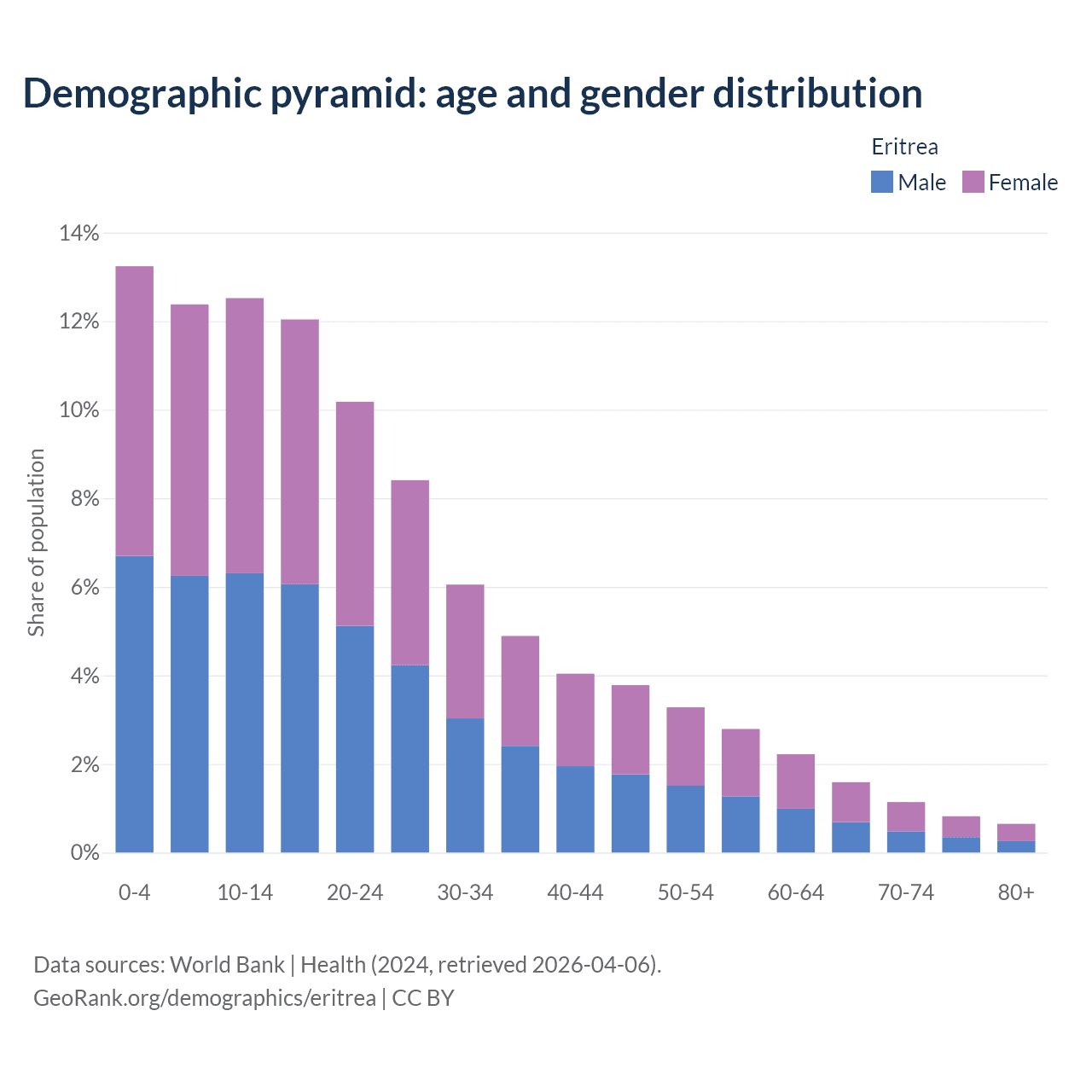 With a population of 3.54M people, Eritrea has a median age of 19.9 years which makes it the 168/196 oldest country. 38.1% of the demographic are children 0-14 years old, 57.7% are working-age people aged 15-64, and 4.2% are older population aged 65+ years.