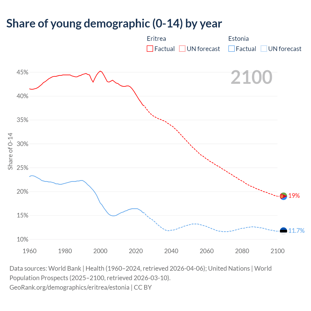 - The share of young demographic (0-15 years old) in Eritrea is 38.1% vs 15.6% in Estonia.