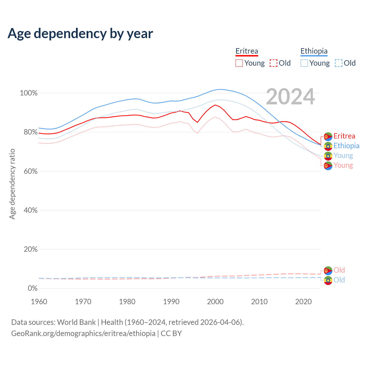 The share of older people aged 65 and over is 4.2% in Eritrea and 3.23% in Ethiopia. Life expectancy in Eritrea compared to Ethiopia .