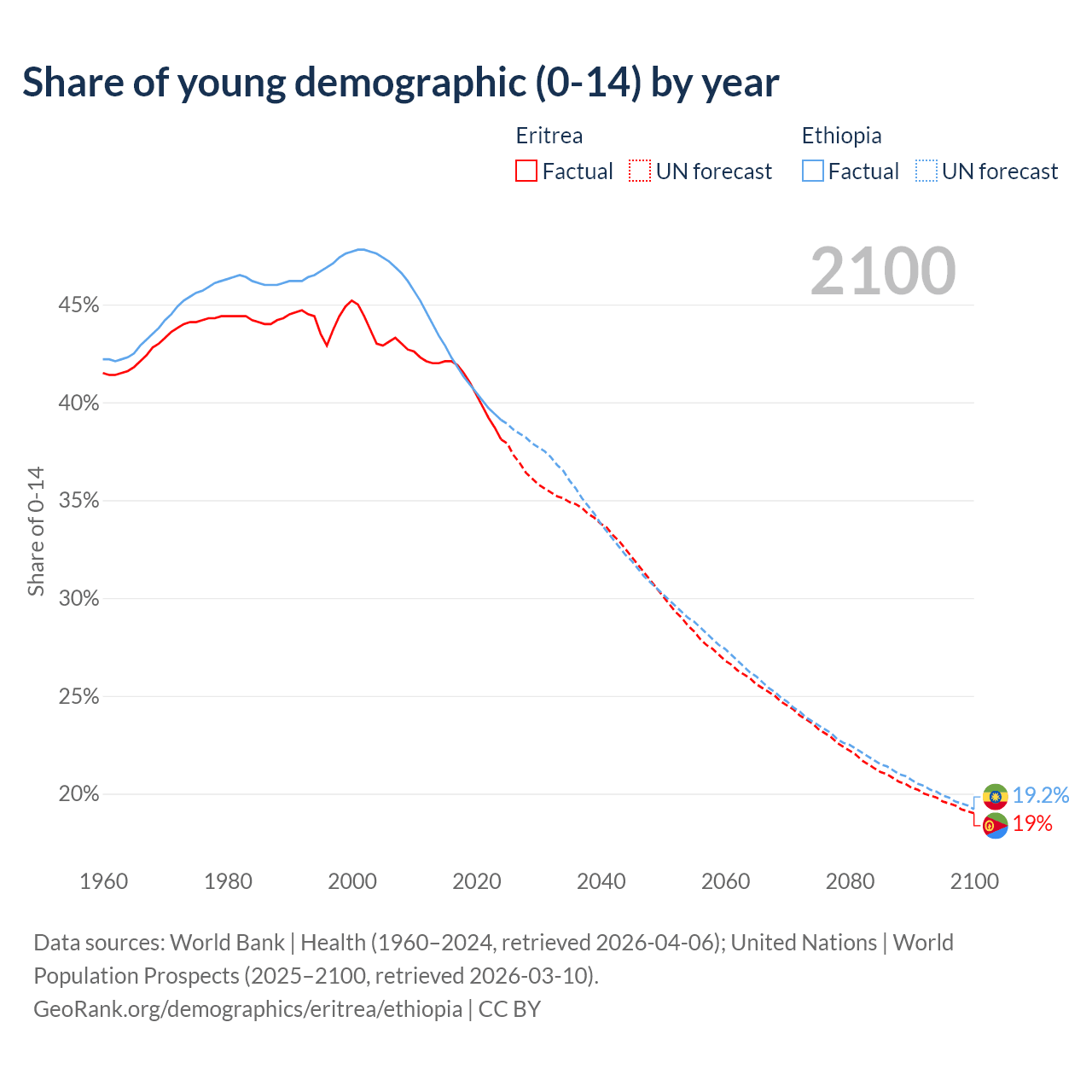 - The share of young demographic (0-15 years old) in Eritrea is 38.1% vs 39.1% in Ethiopia.