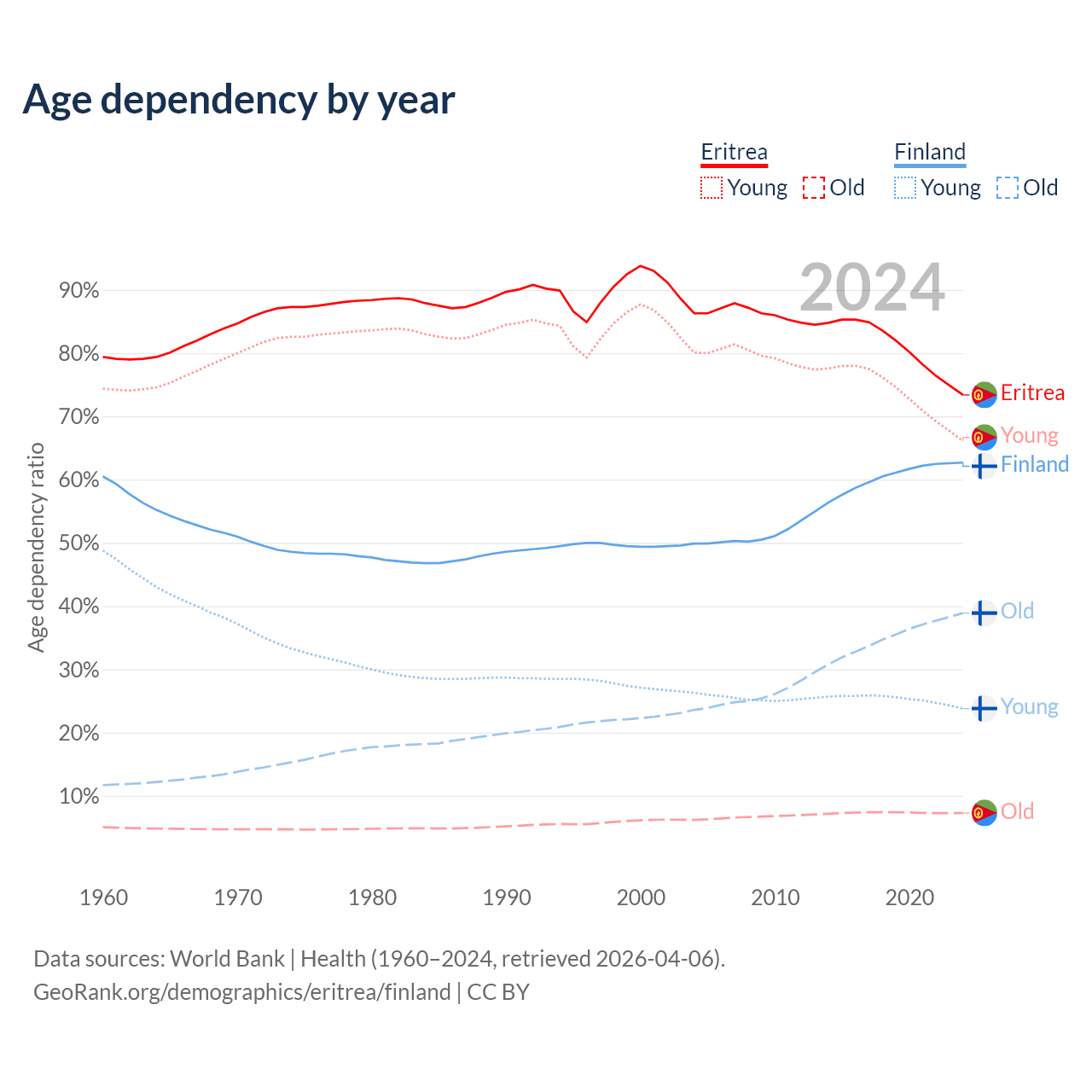 The share of older people aged 65 and over is 4.2% in Eritrea and 23.9% in Finland. Life expectancy in Eritrea compared to Finland .
