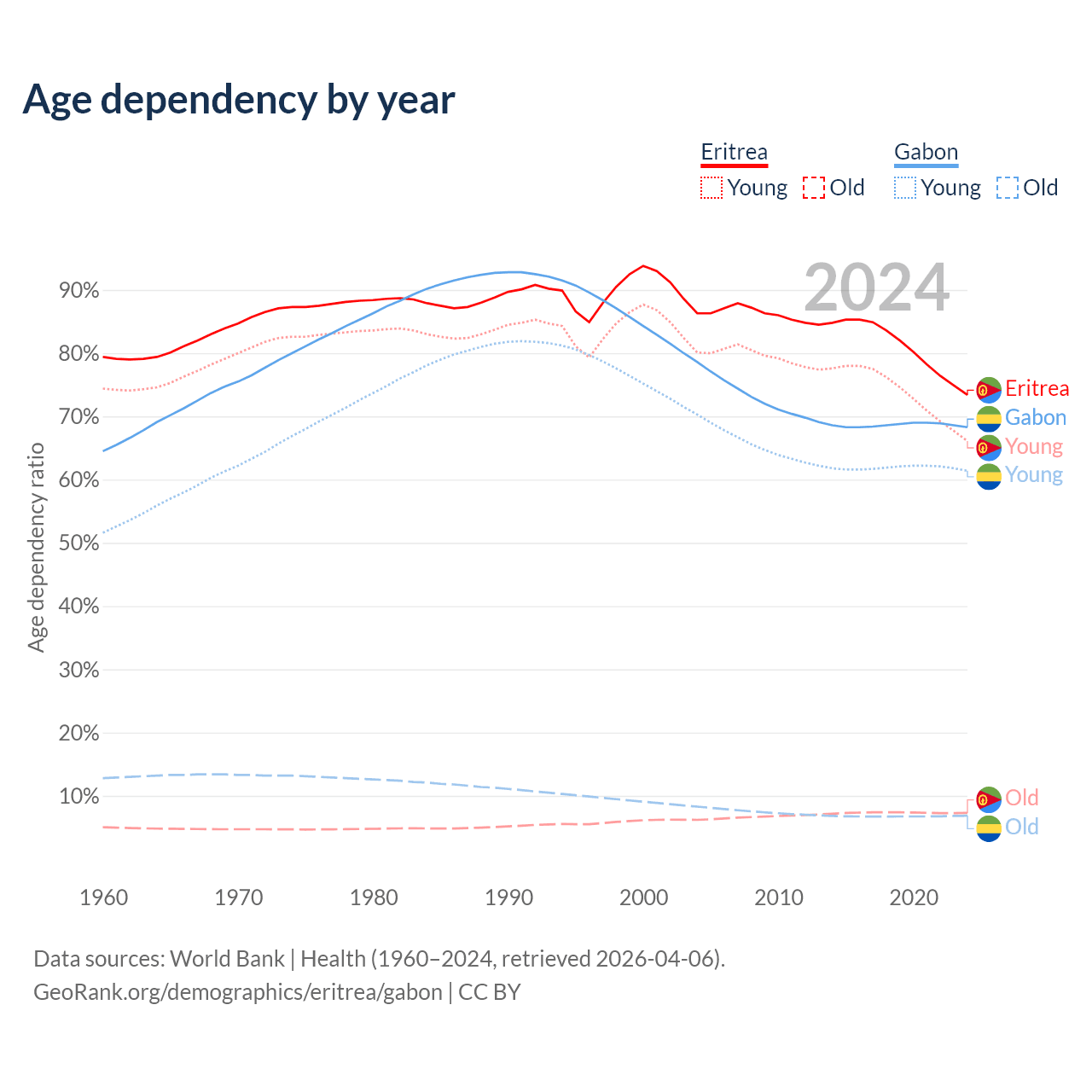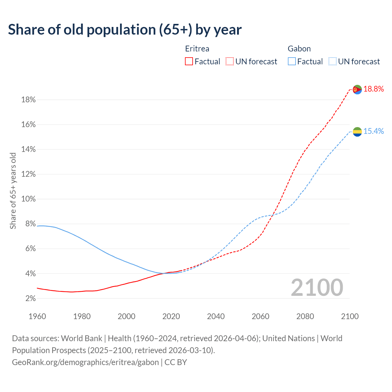 The share of older people aged 65 and over is 4.2% in Eritrea and 4.08% in Gabon. Life expectancy in Eritrea compared to Gabon .
