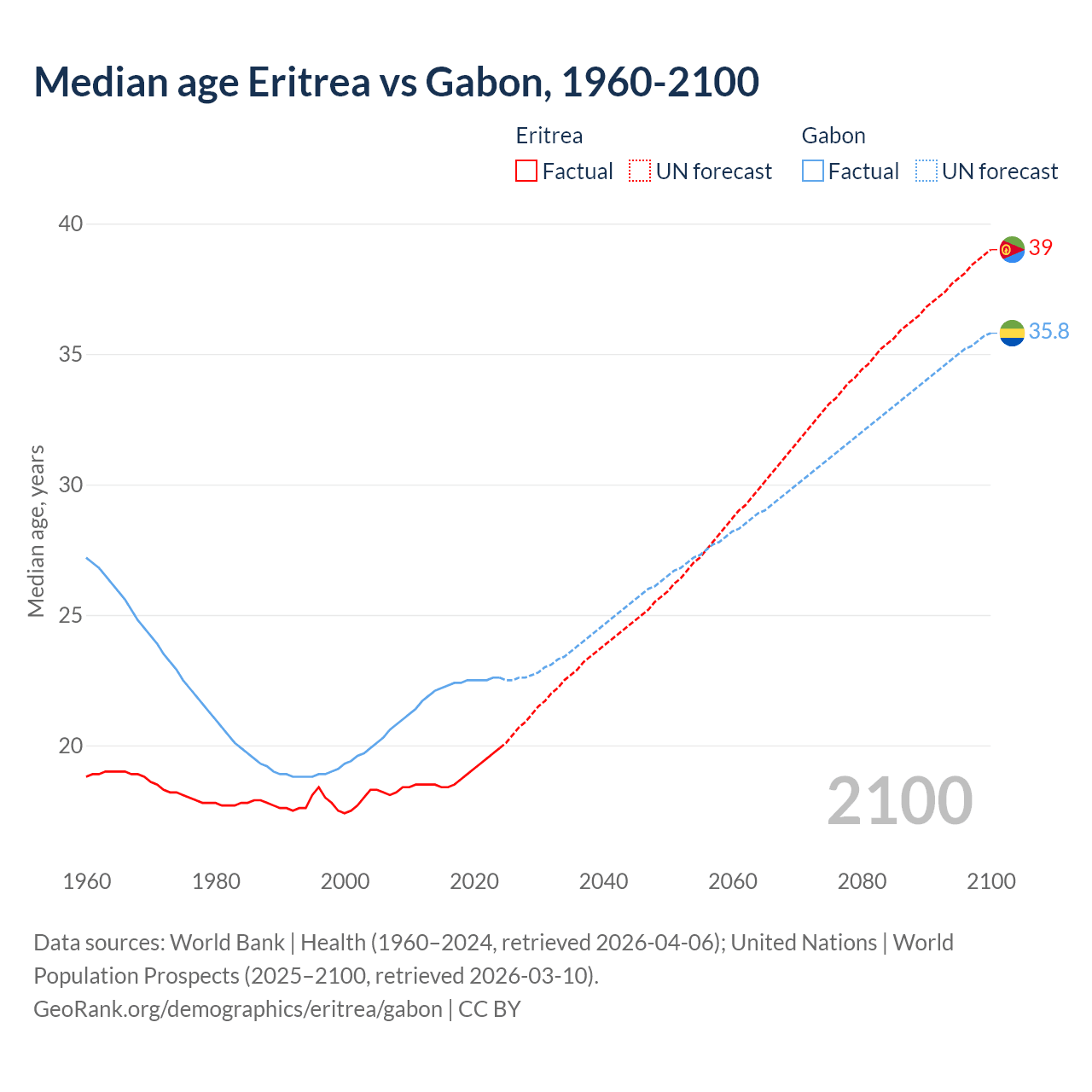 Median age Eritrea vs Gabon, 1960-2100
