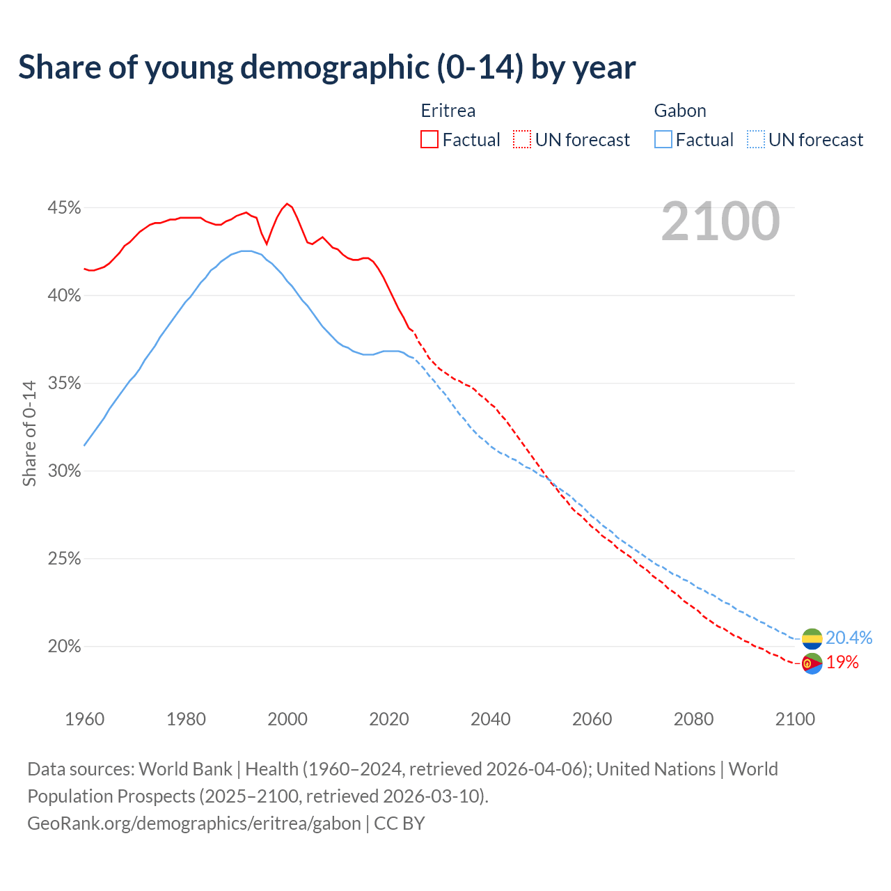 - The share of young demographic (0-15 years old) in Eritrea is 38.1% vs 36.5% in Gabon.