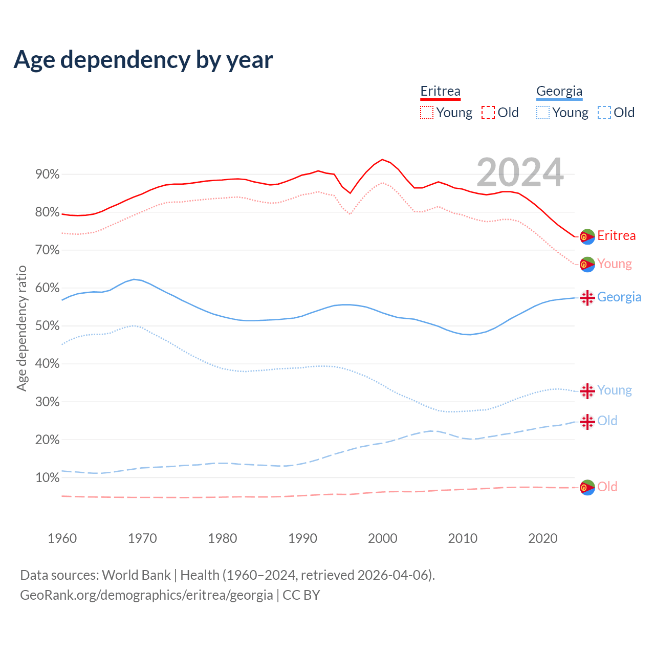 The share of older people aged 65 and over is 4.2% in Eritrea and 15.6% in Georgia. Life expectancy in Eritrea compared to Georgia .