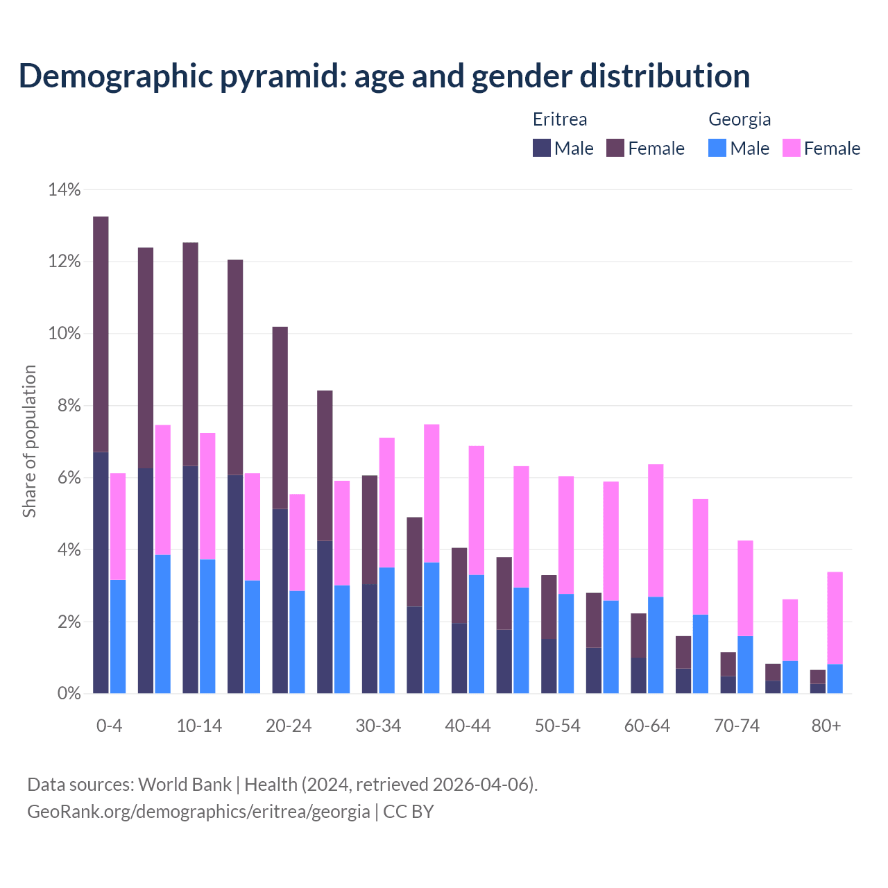 - Eritrea is ranked 168/196 by median age (oldest to youngest) vs 59/196 for Georgia.