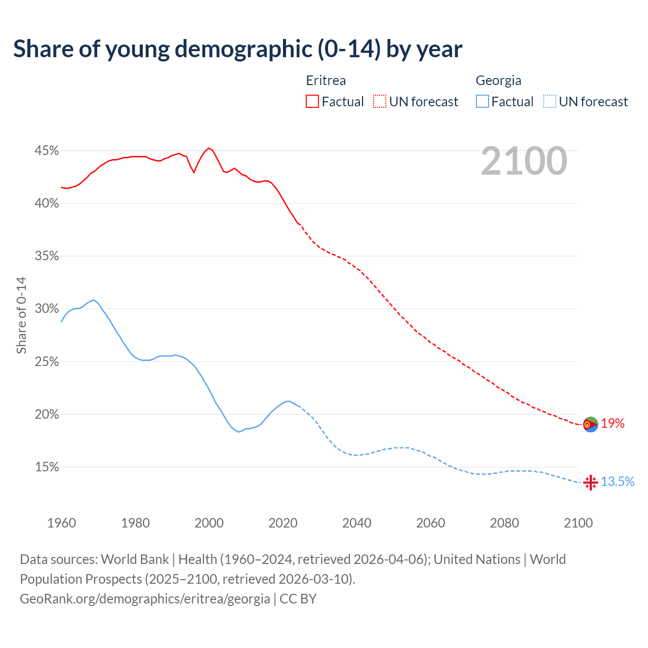 - The share of young demographic (0-15 years old) in Eritrea is 38.1% vs 20.8% in Georgia.