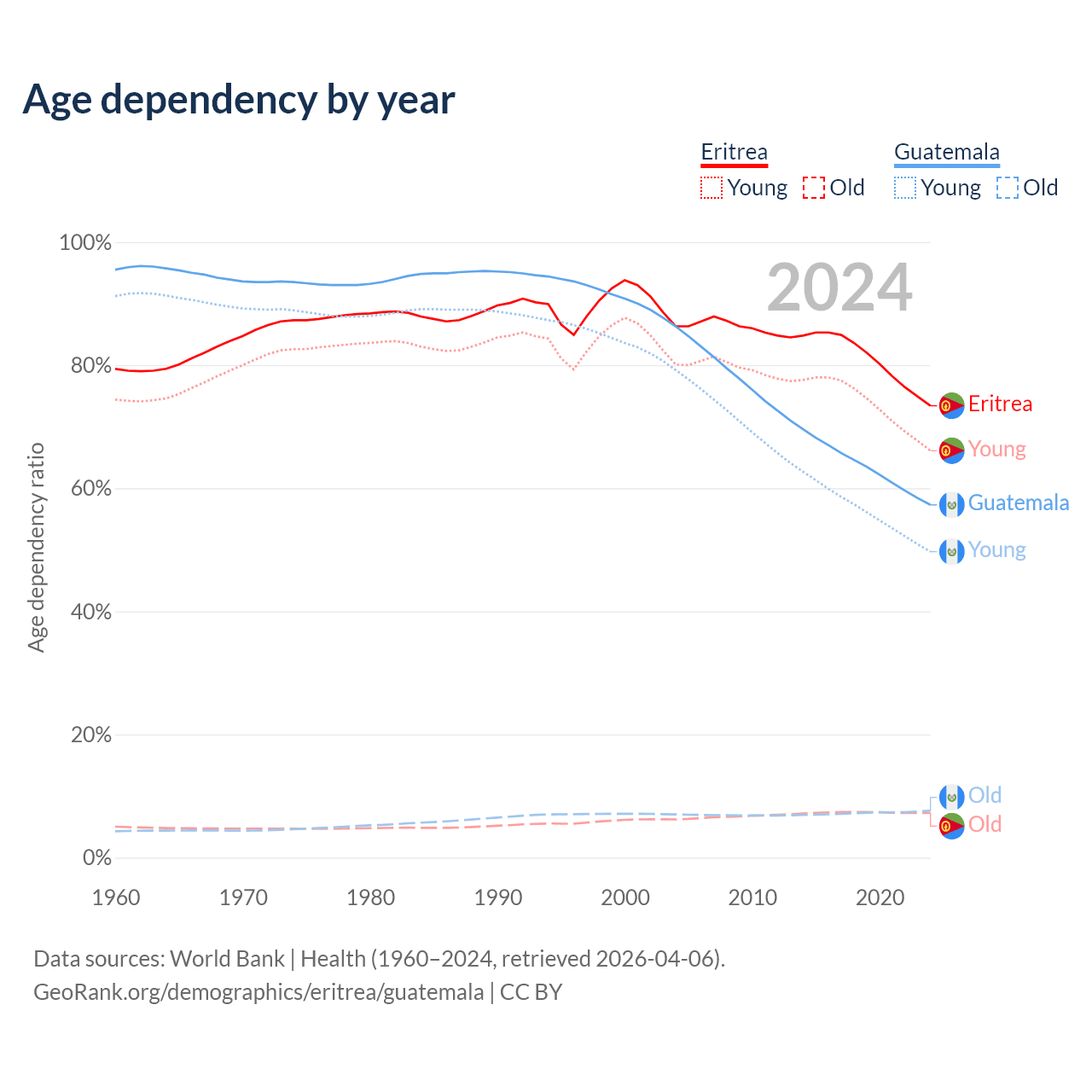 - Eritrea is ranked 168/196 by median age (oldest to youngest) vs 137/196 for Guatemala.