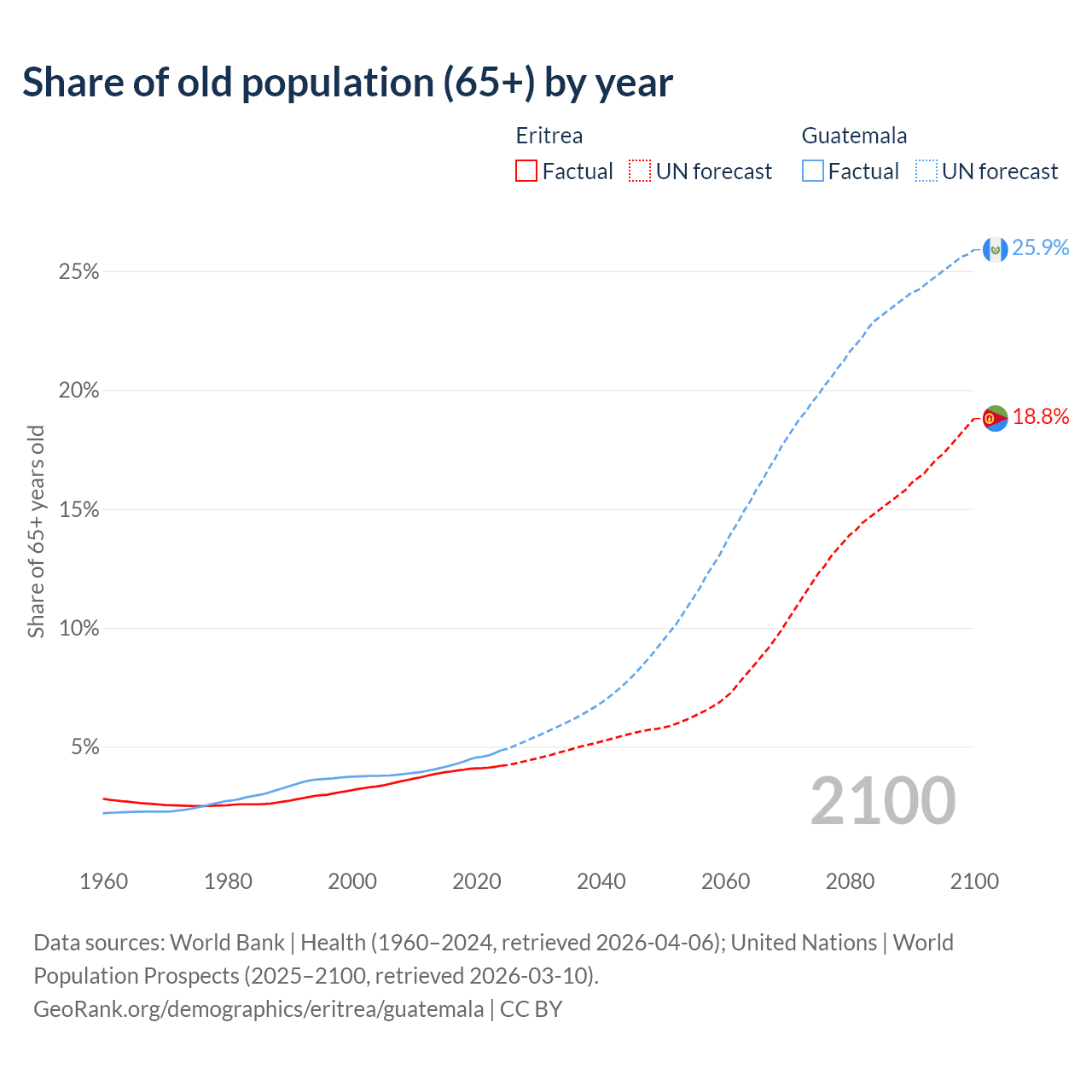 The share of older people aged 65 and over is 4.2% in Eritrea and 4.85% in Guatemala. Life expectancy in Eritrea compared to Guatemala .
